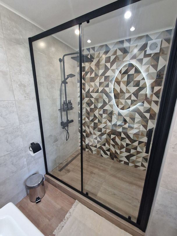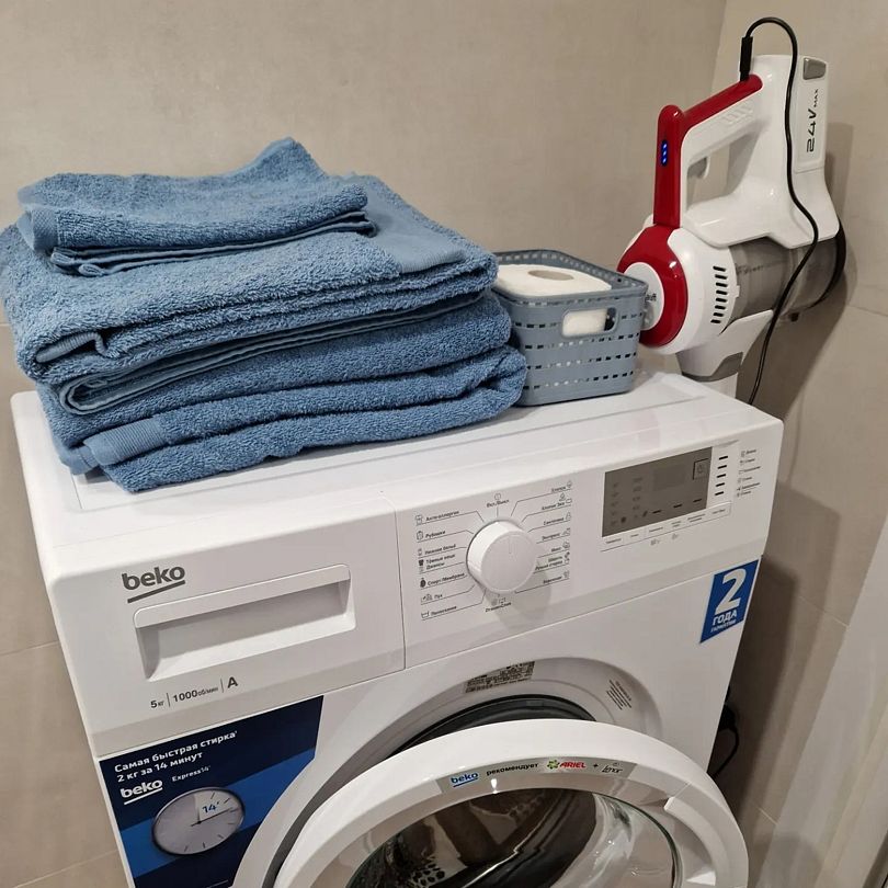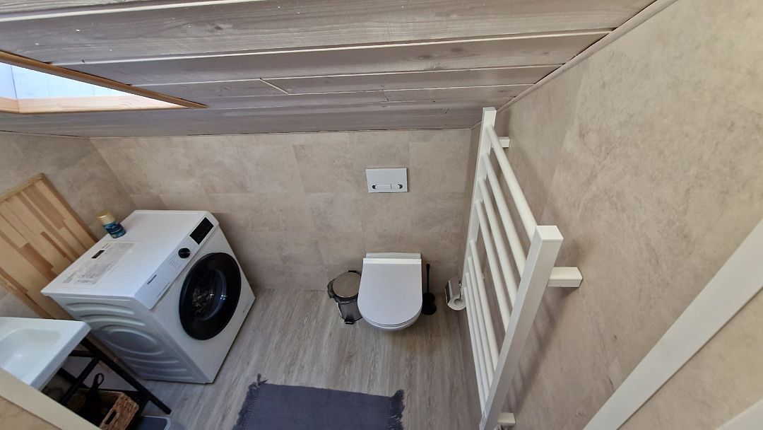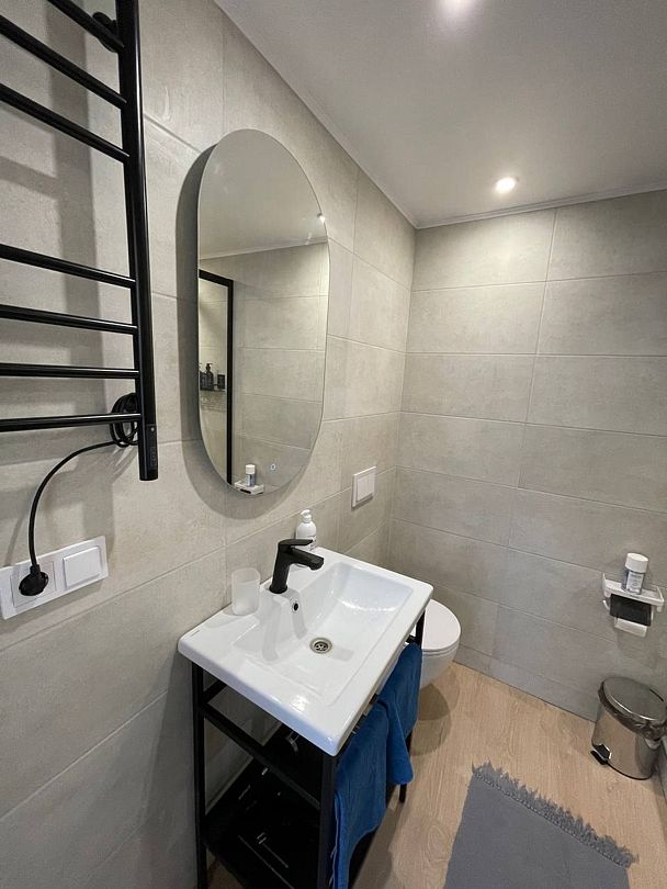 На первом этаже расположен с/у: большая душевая кабина с тропическим душем, подвесной унитаз с инсталляцией, зеркало с парящей подсветкой, беспроводной пылесос, полотенцесушитель и стиральная машина. Фен, утюг, гель-шампунь и кондиционер для волос, набор полотенец отельного качества (плотностью 500 г/м) входят в стоимость проживания.