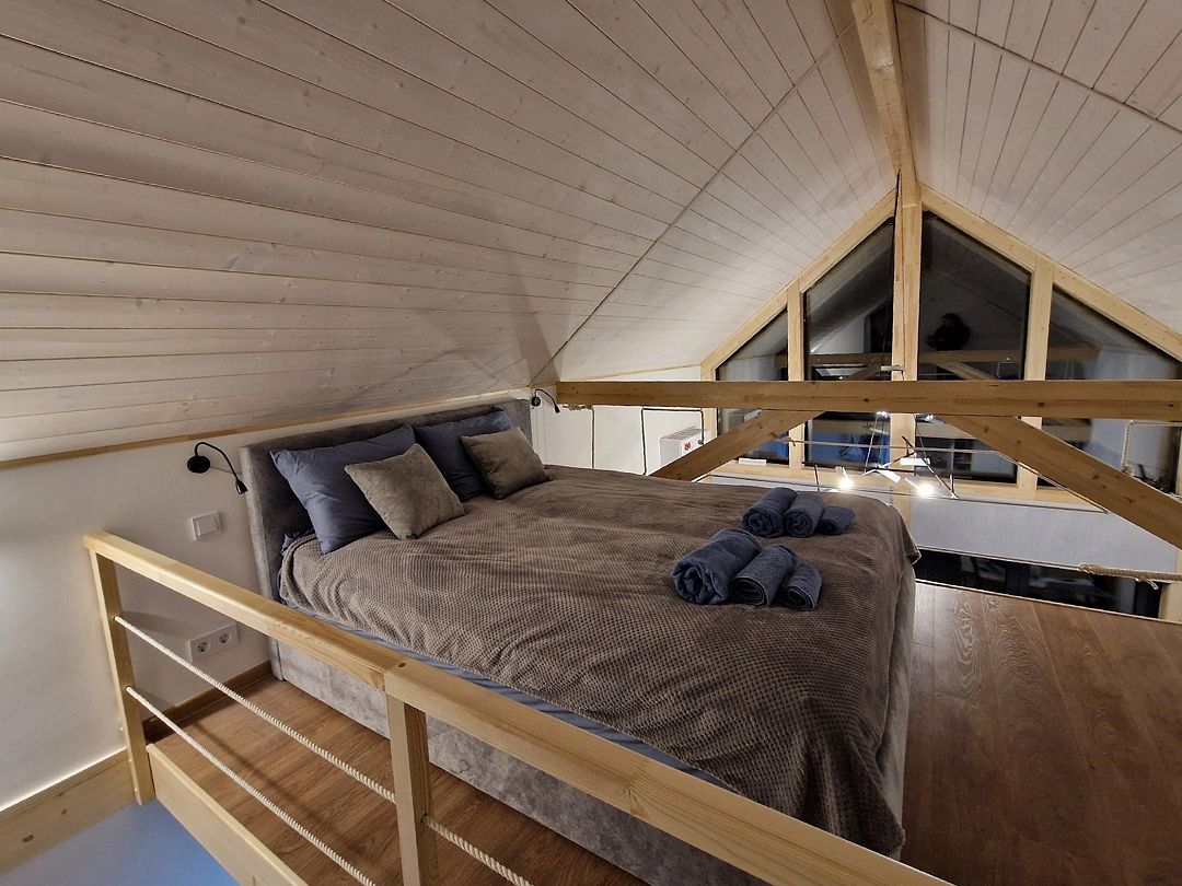 На втором ярусе, куда ведет удобная деревянная лестница, расположена видовая спальня с двуспальной кроватью (200 х 160 см), ортопедическим матрасом премиум-класса и постельным бельем из эко-хлопка, не требующего глажки. Есть стеллаж с коробами для хранения вещей, а также мансардное окно. Пользование Wi-Fi входит в стоимость проживания.