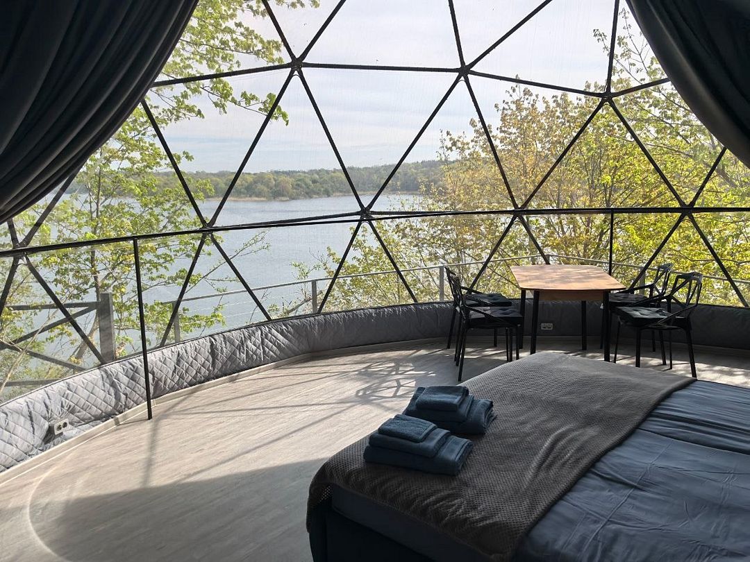 Комфортабельный круглогодичный купольный дом "Атлантика" №5 с шикарным видом на озеро и большой террасой. Построен в 2025 году. Заселение бесконтактное по электронному коду 24/7.