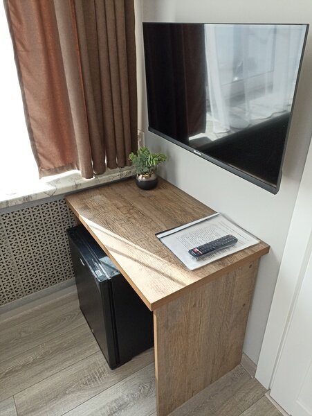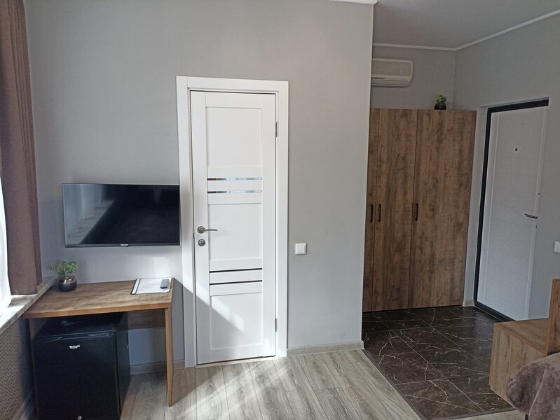 Стандарт с двуспальной и односпальной кроватями, имеется собственный санузел, телевизор, рабочее пространство.