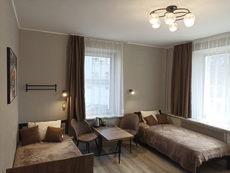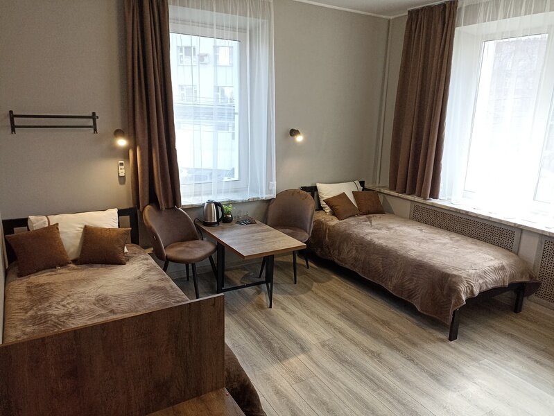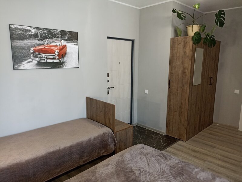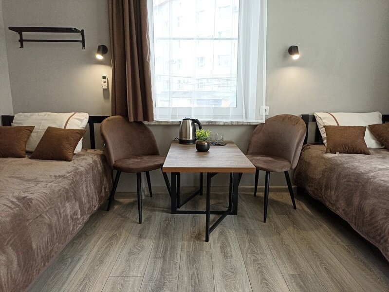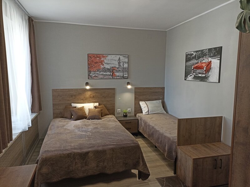 В номере 2 кровати 90 см с ортопедические гипоаллергенные матрасами. Санузел в номере. Также в номере мини бар, ТВ с цифровым телевиденьем и множеством приложений, гигабитный (сверхбыстрый) Wi-Fi, чайник, фен, набор полотенец, тапочки. Дополнительно можно добавить третье спальное место.