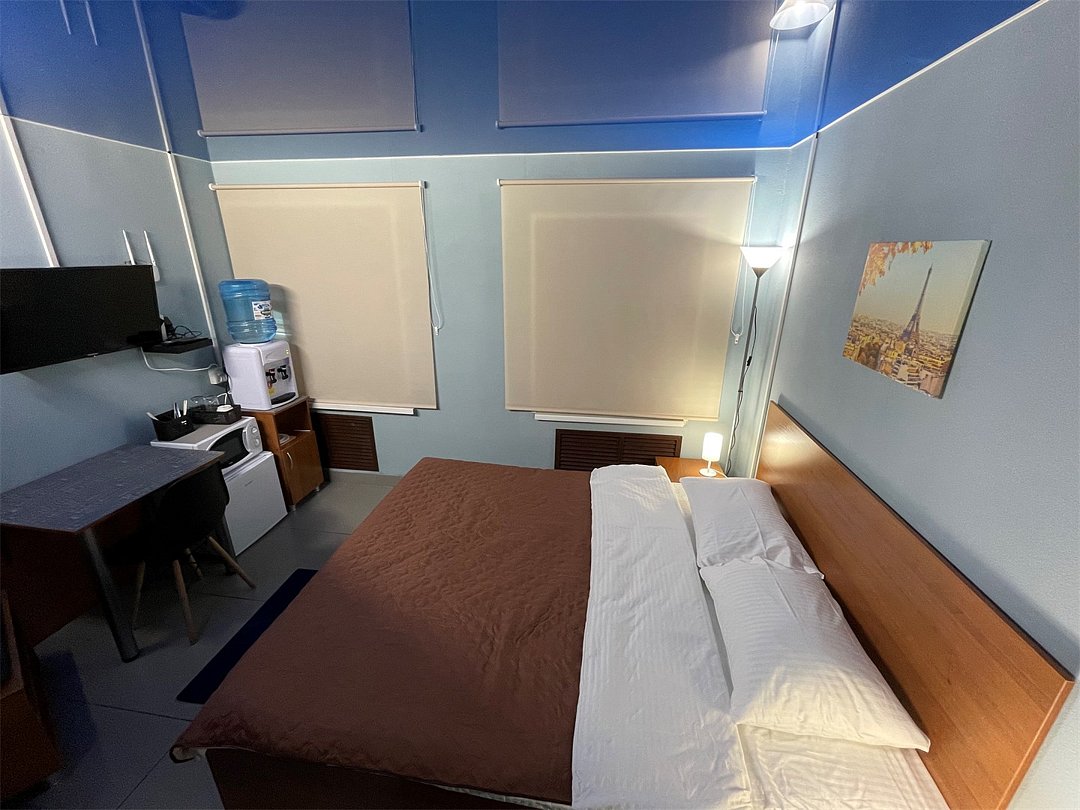 телевизор, Wi-Fi, интернет, светильник, кулер, фен, микроволновая печь, утюг, душевая кабина, двуспальная кровать, гладильная доска, стулья, вешалки, письменный стол, питьевая вода, вид на город, стул, стол, цифровое тв, телевизор с плоским экраном, мини-холодильник, телевизор со Smart TV, номер для некурящих, рабочий столВ номере