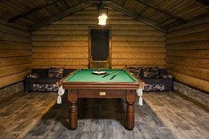 Гостиный зал 70 м², в котором размещены большой обеденный стол, бильярдный зал, барная зона и танцпол. Вместимость за столом до 25 человек.
