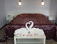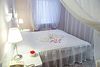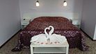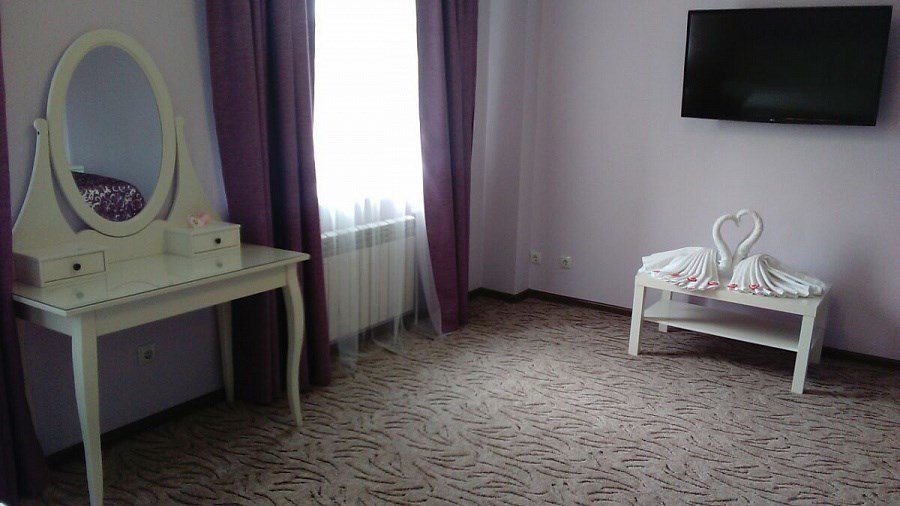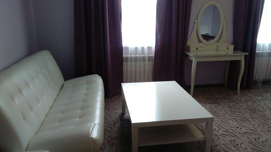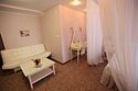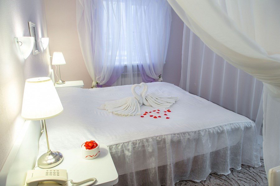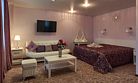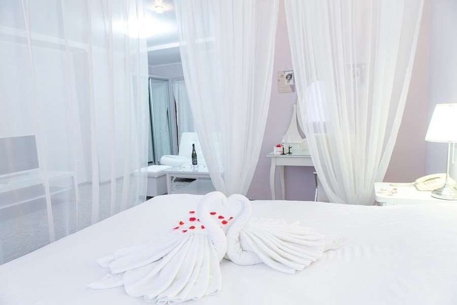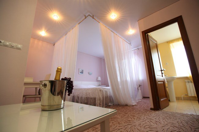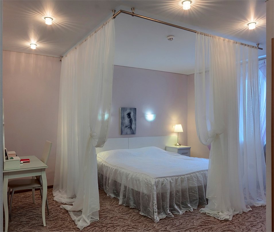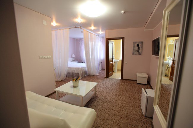 Номер люкс-студио площадью 45 кв .м. находится на третьем этаже отеля, отличается авторским дизайном, оснащен двуспальной кроватью размера "king-size" с балдахином, белым кожаным диваном, бьюти-столиком и другой мебелью, подобранной для создания приятной и располагающей к отдыху и романтике атмосфере. Номера предлагают полный набор удобств и принадлежностей, а также предусмотрена бутилированная вода, что обеспечит вам уют и комфорт во время всего вашего пребывания у нас в отеле.Услуги и удобства