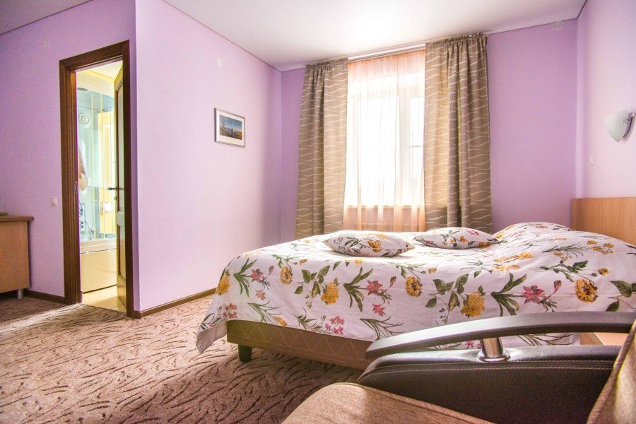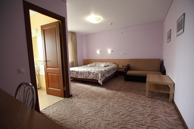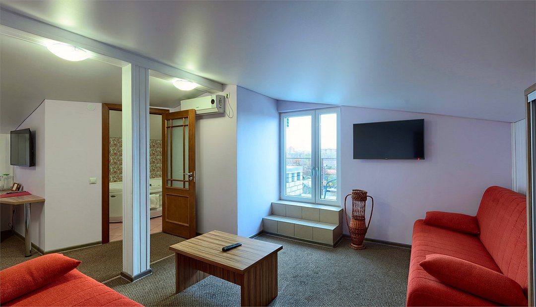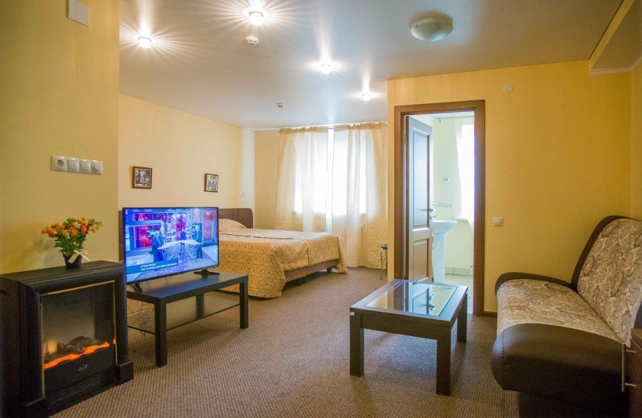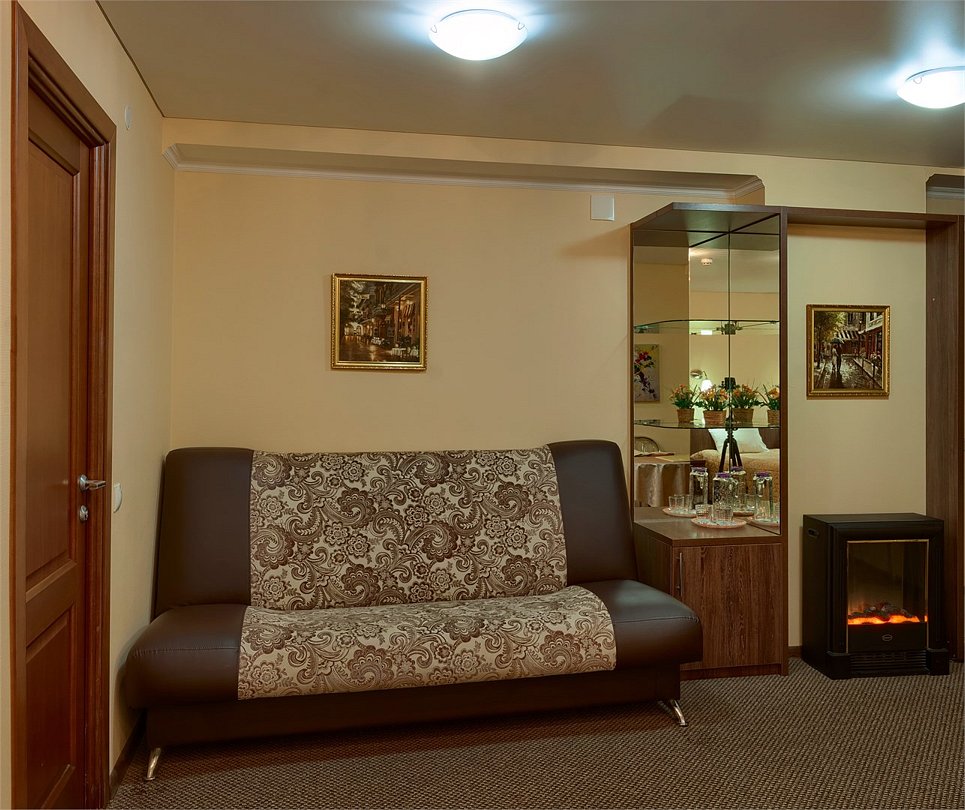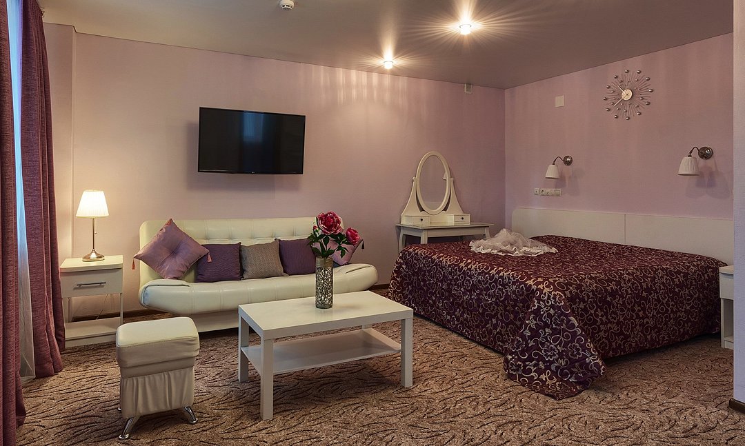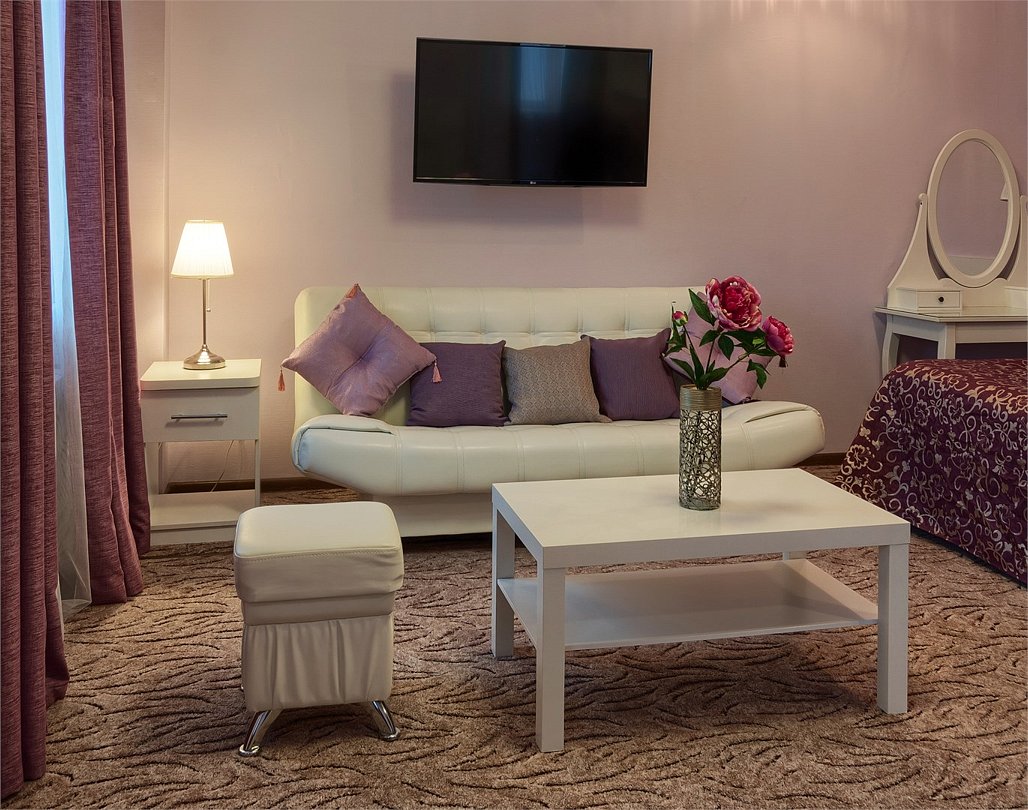 Номера люкс-студио с джакузи – самые удобные и просторные, площадью 45 кв. м., расположены на четвертом и пятом этажах отеля. В номере двуспальная кровать и раскладной двухместный диван, площадь номера визуально поделена на гостиную и спальню, есть и пространство для рабочего места. Номера предлагают полный набор удобств и принадлежностей, а также предусмотрена бутилированная вода, что обеспечит вам уют и комфорт во время всего вашего пребывания у нас в отеле.Услуги и удобства