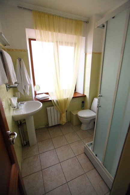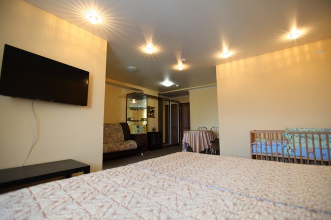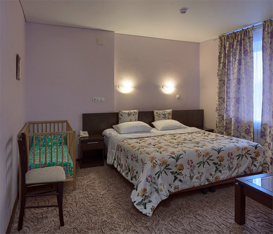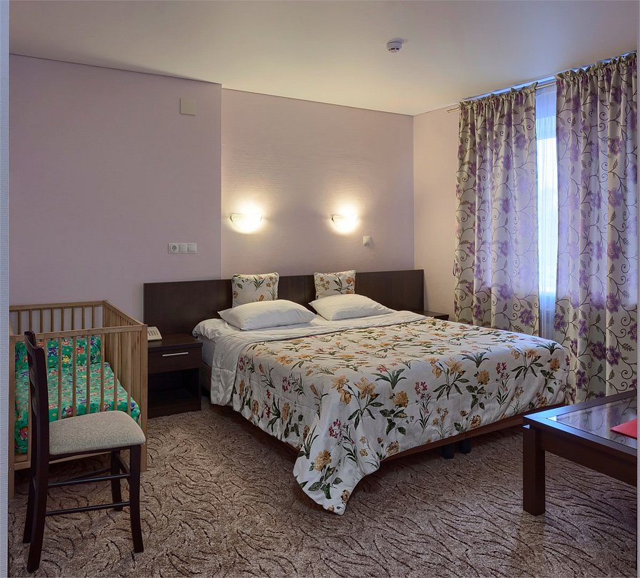 В номере, расположенном на третьем этаже отеля, площадью 35 кв. м., помимо двуспальной кровати и дивана, предусмотрены особые условия для маленьких туристов. Для детей до трех лет бесплатно предоставляется детская кроватка с постельный бельем. Номер оборудован совмещенным санузлом с душевой кабиной.Услуги и удобства