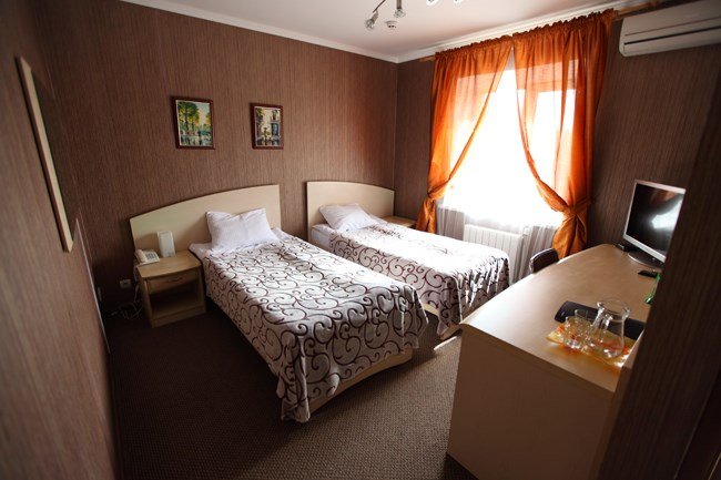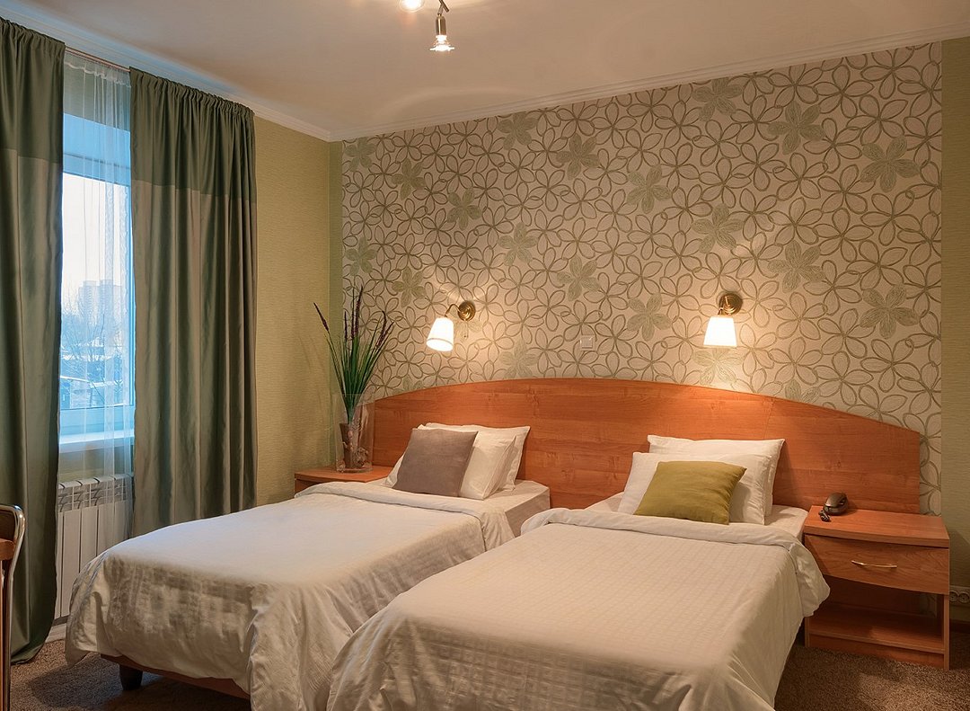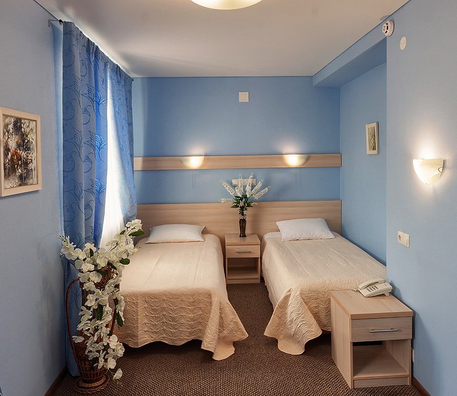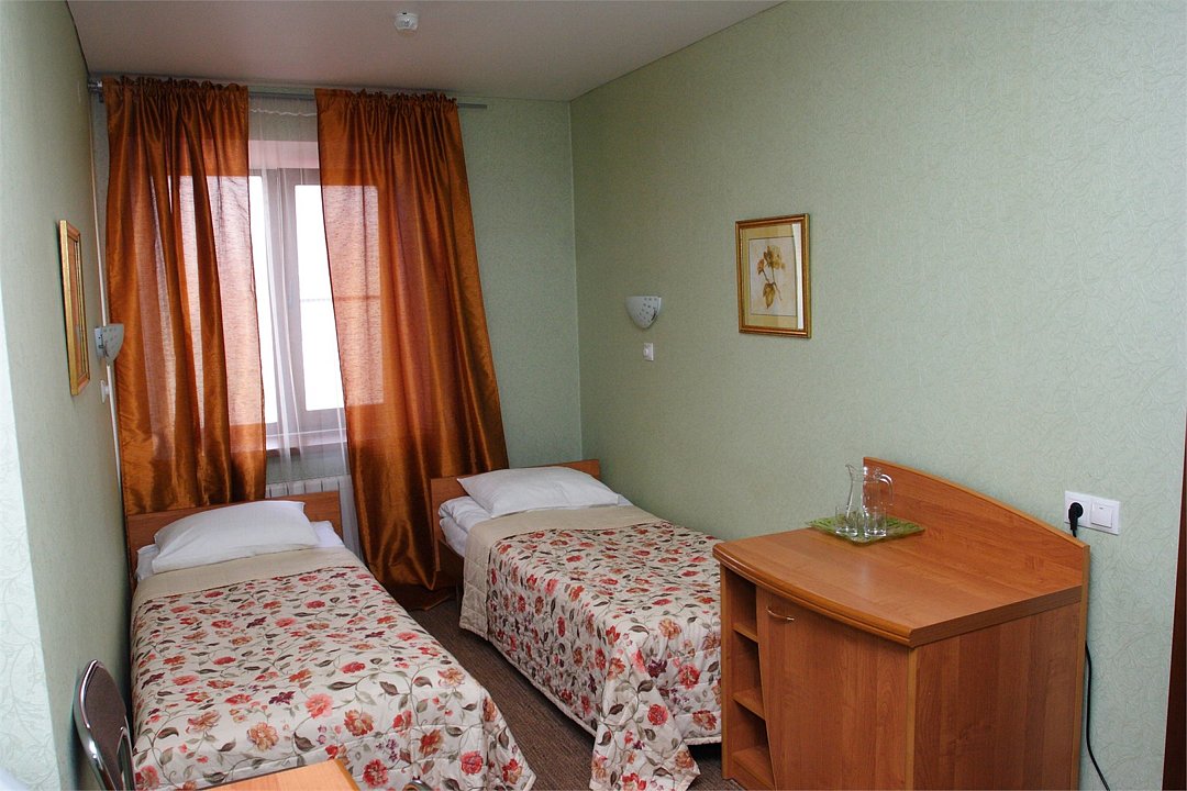 Стандартный двухместный номер – классический вариант для двухместного размещения. Категория Стандарт подразумевает проживание гостей на втором и третьем этажах здания отеля. Стандартный двухместный номер отличается от экономичного варианта большей площадью (24 кв. м.). В номере находятся две односпальные кровати, по желанию гостя они трансформируются в одну двуспальную кровать. Для комфортного проживания и отдыха гостей номер оснащен совмещенным санузлом с душевой кабиной.Услуги и удобства