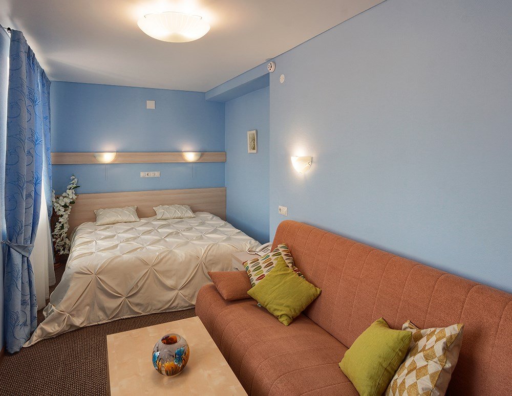 Уютный однокомнатный номер площадью 28 кв. м., в котором собрано всё необходимое, расположен на четвертом этаже отеля. Помимо двух односпальных кроватей (по желанию гостя могут трансформироваться в одну двуспальную), номер оснащен диваном, который может использоваться в качестве дополнительного места.Услуги и удобства