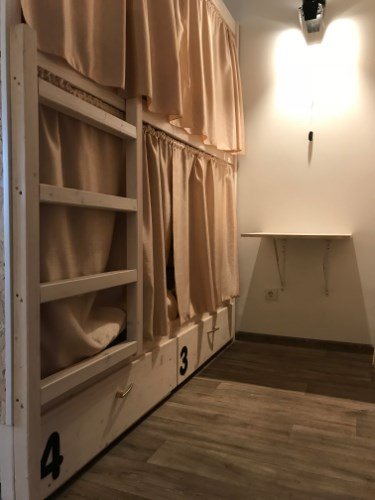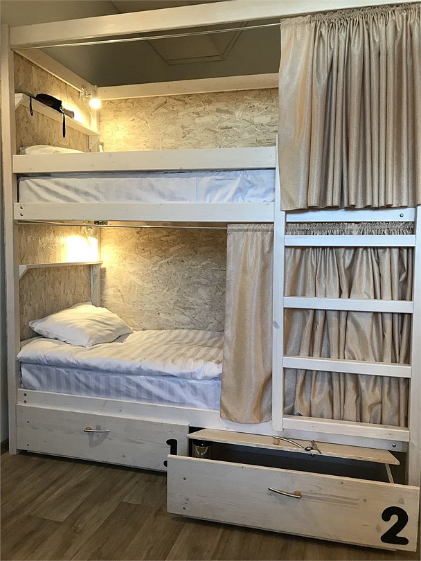 В номере находится 5-двухъярусных кроватей с ортопедическими матрацами, бесплатный WI-FI. Номер оборудован прикроватными светильниками, розетками, персональными запирающимися шкафчиками - локерами и вешалками для одежды. . Комплект чистых полотенец и постельного белья предоставляется гостю бесплатно Номер для семьи, группы студентов, компании друзей, а так же для индивидуальных путешественников желающих сэкономить.Услуги и удобства