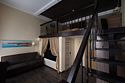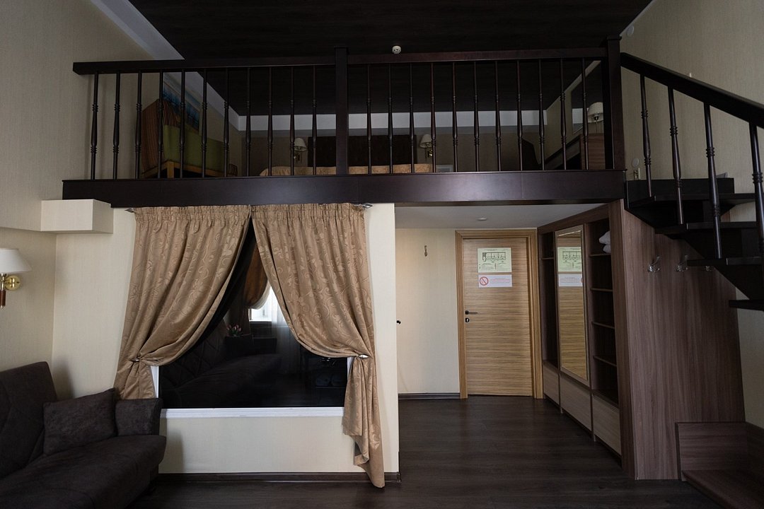 Двухуровневые номера категории «Дуплекс» особенно оценят деловые люди, которые привыкли отдыхать и работать с комфортом. Комнаты подходят для коротких командировочных визитов и длительного проживания до четырех человек. На первом этаже можно принимать гостей и решать деловые вопросы – для этого предусмотрен удобный раскладывающийся диван и организовано рабочее место. Прихожая, санузел, гостиная с журнальным столиком и удобными стульями также находятся на нижнем ярусе. На втором уровне расположилась большая двуспальная кровать. В стену ванной комнаты встроено большое окно с жалюзи, что позволяет наполнить ее дневным светом, приоткрыв жалюзи. Комнаты оформлены в приятных кремово-коричневых тонах и оснащены всей необходимой техникой. Вместительные шкафы-купе с дверцами в пол визуально расширяют пространство номера, что в сочетании с кремовым оттенком обоев делает номер просторным и светлыми. Двухъярусная комната общей площадью 35 кв.м Высота потолков 4 м. Большая двуспальная кровать Кинг сайз (200 см) Рабочее место Кондиционер воздуха Mitsubishi Шкаф-купе с зеркальными дверцами Подставка для багажа Ванна 140 см Фен для волос Мини-бар-холодильник Индивидуальный сейф Чайник Телевизор Купальный халат, тапочки Бесплатный Wi-FiУслуги и удобства