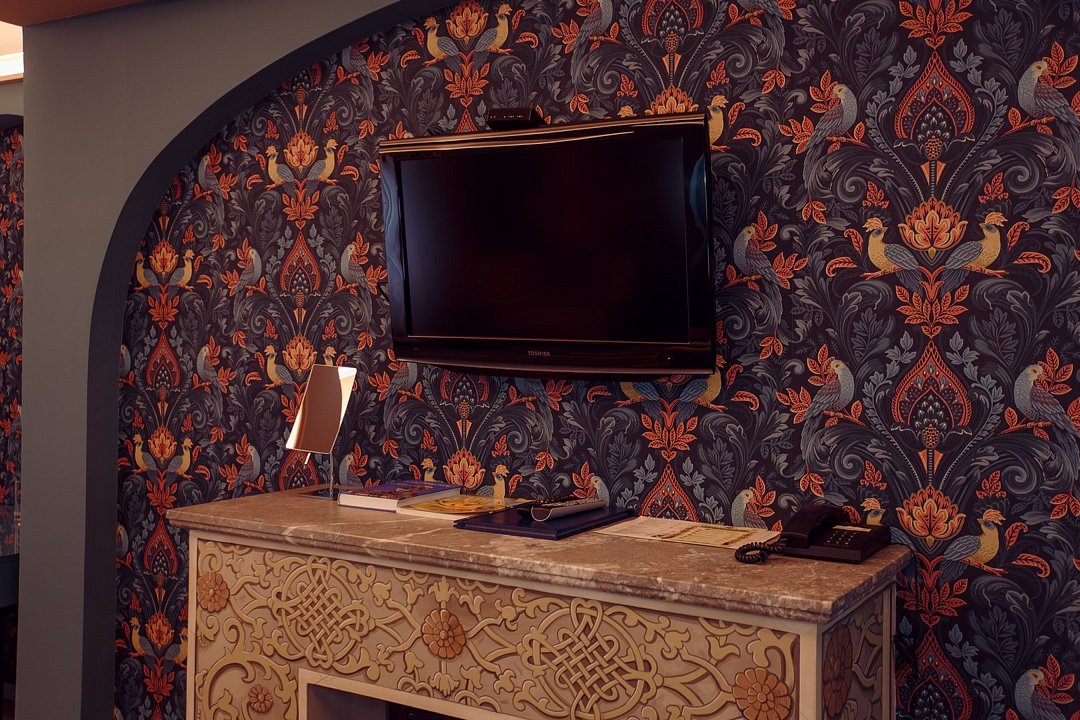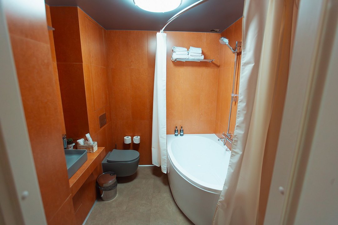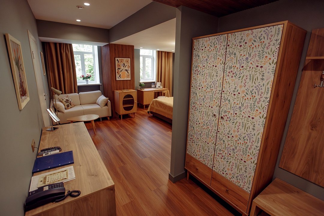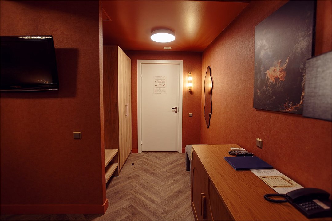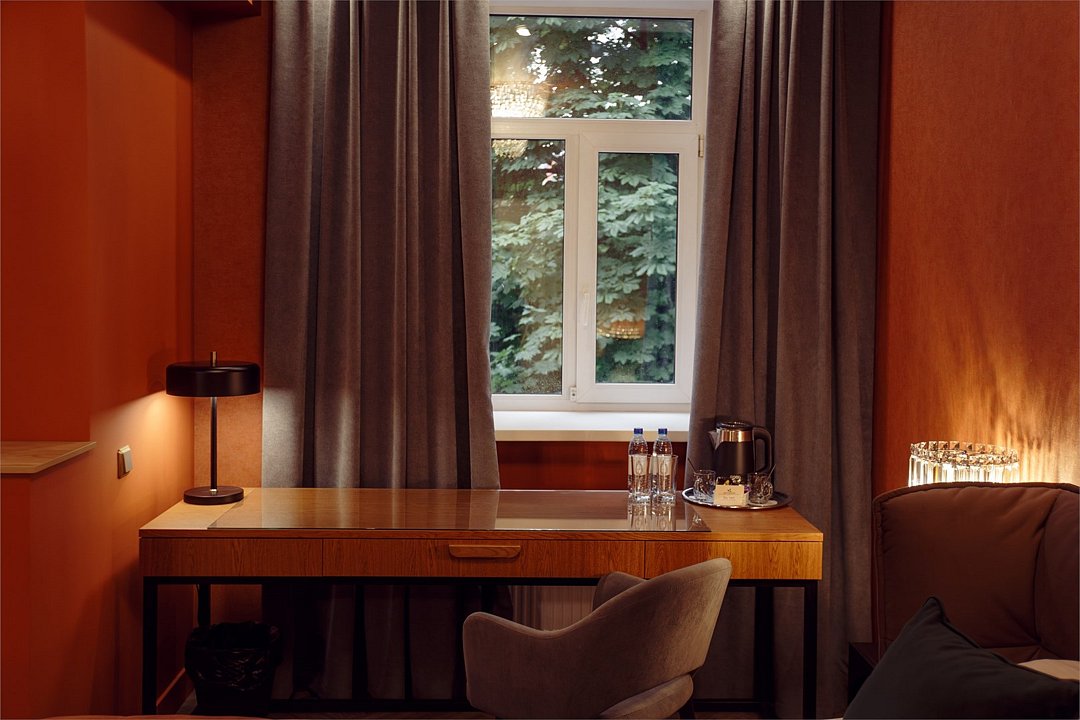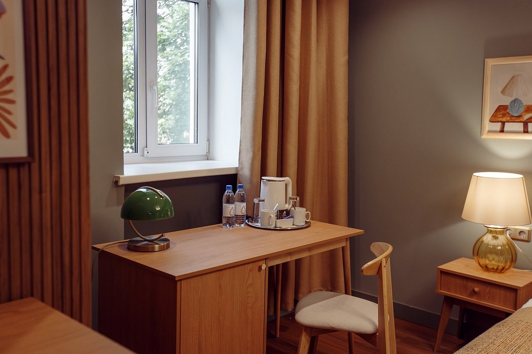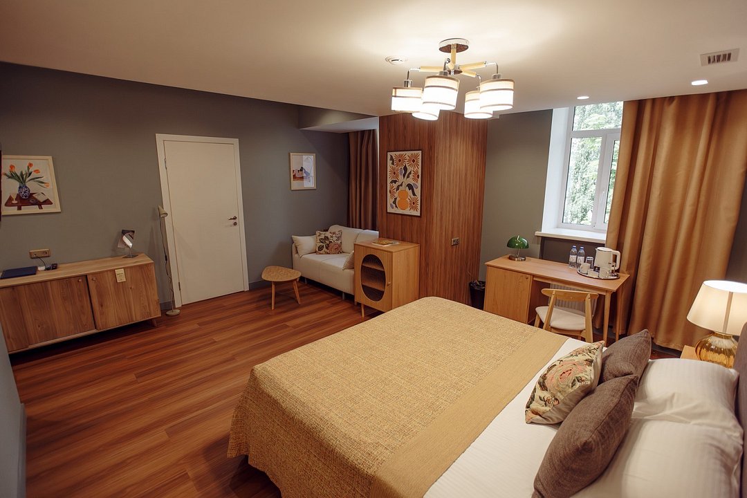 телевизор, Wi-Fi, интернет, кондиционер, светильник, настольные лампы, фен, утюг, ванная комната, ванна, санузел, водонагреватель, халаты, банные полотенца, тапочки, двуспальная кровать, гладильная доска, диван, тумбы, стулья, шкаф для одежды, вешалки, журнальный столик, письменный стол, зеркало, пуфики, мини-бар, чайный набор, чайник, унитаз, раковина, мягкая мебель, косметическое зеркало, питьевая вода, отопление, душ, вид на город, стаканы, стул, стол, тумба, диван-кровать, раскладной диван, внутренний телефон, телевизор с плоским экраном, мини-холодильник, гостиничная парфюмерия, номер для некурящих, пуфик, можно с питомцамиВ гостиничном номере