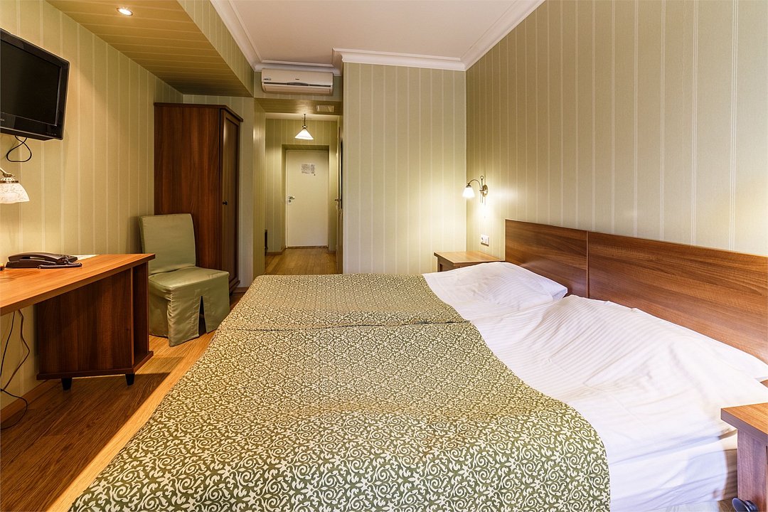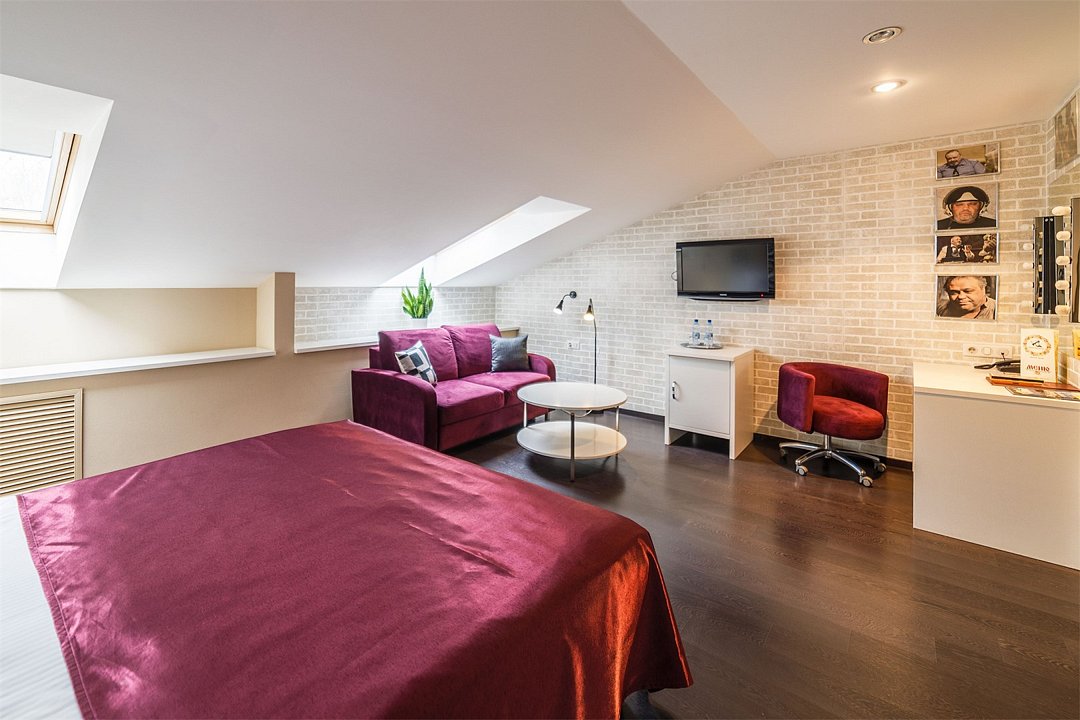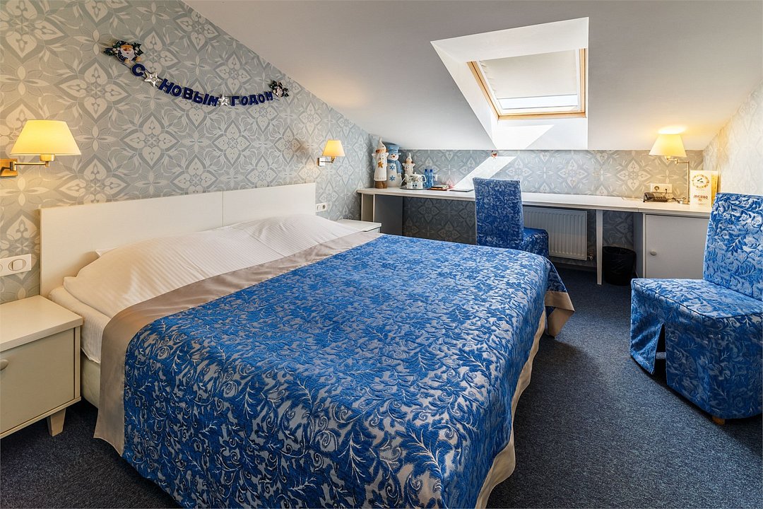 Двухместный номер на мансардном этаже со всеми удобствами оформлены в стилистике фильмов снимавшихся в Ярославле и Ярославской области. С двумя односпальными или с одной двухспальной кроватью. В номере рабочий стол, мини-бар, шкаф для одежды, прикроватные тумбочки, кондиционер. Собственная ванная комната с косметическими принадлежностями, предоставляются тапочки, халаты по запросу. Завтрак "шведский стол" входит в стоимость проживания. При бронировании просьба уточнять доступность понравившегося номера.Услуги и удобства