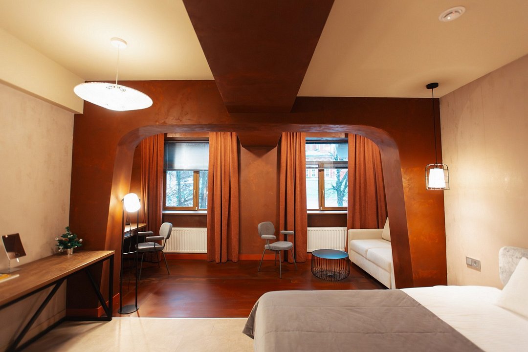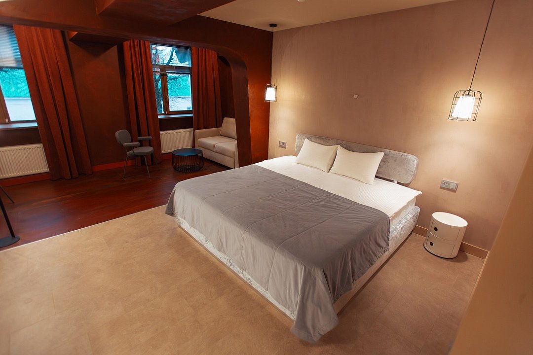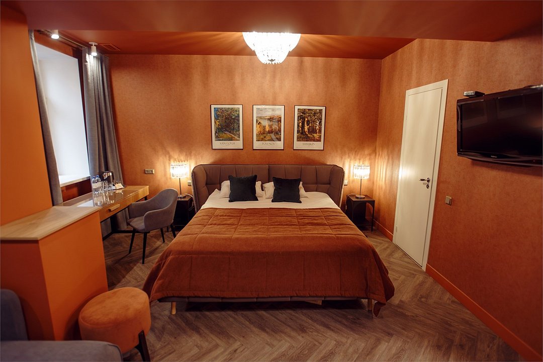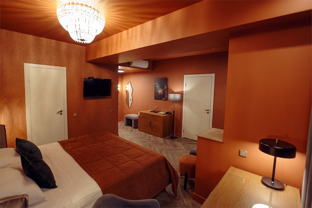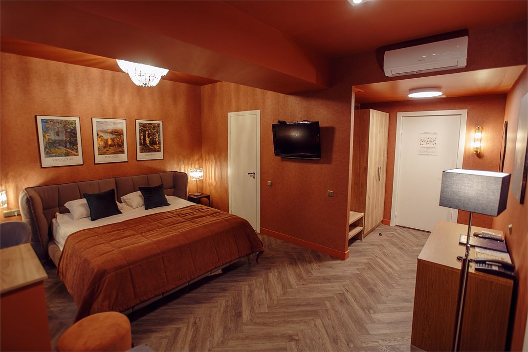 Wi-Fi, интернет, кондиционер, светильник, фен, ванная комната, ванна, водонагреватель, банные полотенца, тапочки, двуспальная кровать, тумбы, стулья, вешалки, журнальный столик, зеркало, мини-бар, сейф, унитаз, раковина, косметическое зеркало, питьевая вода, отопление, душ, вид на город, стаканы, стул, тумба, диван-кровать, телевизор с плоским экраном, мини-холодильник, гостиничная парфюмерия, пуфик, рабочий стол, можно с питомцамиВ гостиничном номере