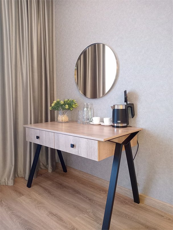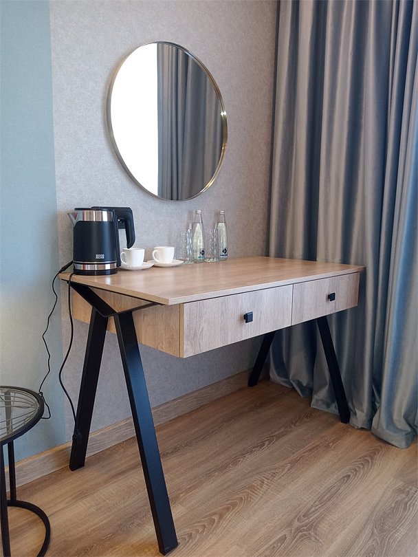Wi-Fi, кондиционер, светильник, фен, ванная комната, душевая кабина, санузел, халаты, банные полотенца, тапочки, двуспальная кровать, шкаф для одежды, гардеробная, зеркало, комод, чайный набор, обслуживание номеров, информационная карта, меню, минеральная вода, чайник, унитаз, раковина, косметическое зеркало, питьевая вода, душ, кресло, туалетный столик, тумба, туалетный столик, туалетные средства, туалет, цифровое тв, внутренний телефон, телевизор с плоским экраном, мини-холодильник, номер для некурящих, вид на лес, пуфик, бутилированная вода, мыло, без питомцевВ гостиничном номере
