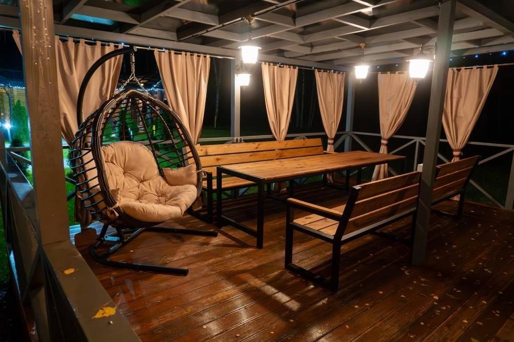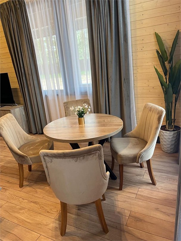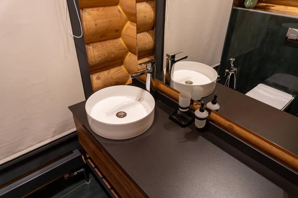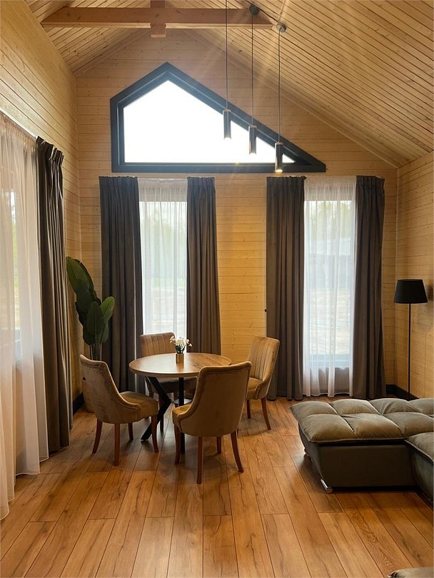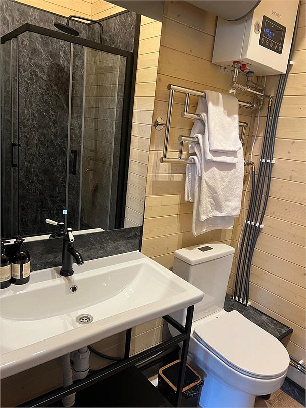 кабельное телевидение, Wi-Fi, интернет, светильник, фен, ванная комната, душевая кабина, санузел, халаты, банные полотенца, тапочки, двуспальная кровать, диван, шкаф для одежды, гардеробная, вешалки, журнальный столик, зеркало, комод, пуфики, чайный набор, информационная карта, меню, чайник, унитаз, раковина, мягкая мебель, косметическое зеркало, питьевая вода, кресло, вид во двор, стаканы, туалетный столик, тумба, туалетный столик, туалетные средства, туалет, цифровое тв, диван-кровать, раскладной диван, внутренний телефон, телевизор с плоским экраном, мини-холодильник, шкаф-купе, номер для некурящих, вид на лес, пуфик, фумигатор, без питомцевВ эко-доме