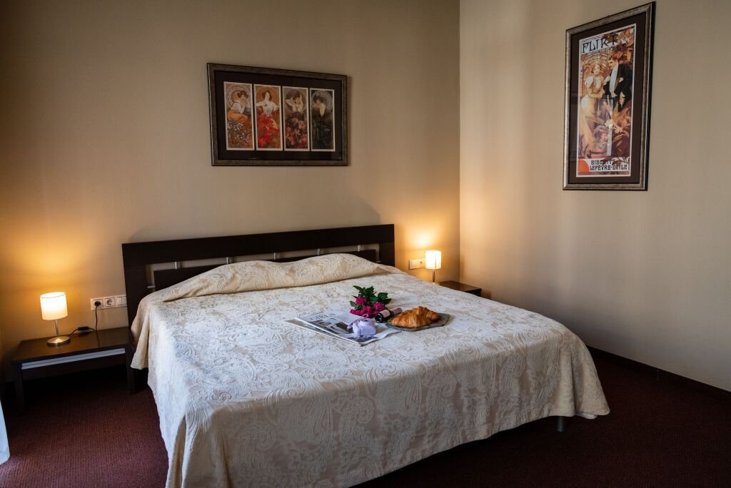 Путешествие с паройОтдых в Модерне г. Ярославль.Отдыхали в данном отеле в период с 3-6 сентября 2023г. У нас был номер улучшений на втором этаже, он чуть больше стандартного, а также есть бонус- балкон, где можно посидеть скоротать вечерок за бокалом вкусного вина. Что можем сказать про номер, номер большой, но очень уставший, относительно чистоты, каждому свое, но можно было немного отмыть, снять паутину с потолка и сделать химчистку напольного покрытия, кресла и стула, они все в пятнах, тюль и шторы тоже не помешало бы отстирать от пятен. Кто-то писал, что хорошая шумомзоляция, не можем это подтвердить, очень хорошо слышно соседей и улицу. Расстраивают эти мелочи. Но из этих мелочей складывается общее впечатление об отеле. В номере есть халат, тапочки, бутылочки с водой, чайник, чай, кофе (в пакетиках), одноразовые зубные щетки, гель для душа и шампунь (не знаем, что есть в номере стандарт). При этом свежая сантехника и просторная душевая. Оценку 4 ставим только благодаря континентальному завтраку. Понравились завтраки, на выбор несколько вариантов горячего по меню, которые готовят специально для вас, также подают холодную тарелку с закусками (несколько кусочков сыра, один кусочек мясной нарезки, вареное яйцо, огурчик, помидорчик, круассан и очень вкусное варенье). Также можно налить морс, воду, кофе и чай. Нам в целом хватало. Можно дополнительно заказать что-то по меню, цены достаточно демократичны. Расположение удачное, достаточно близко к центру и основным достопримечательностям. У отеля есть парковка (внутренняя, буквально на 5 авто и напротив центрального входа) правда не всегда получалось припарковаться рядом, один раз пришлось поставить машину недалеко от отеля на бесплатной парковке вдоль улицы. Если сильно не заморачиваться, то место всегда можно найти.