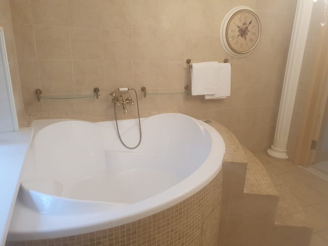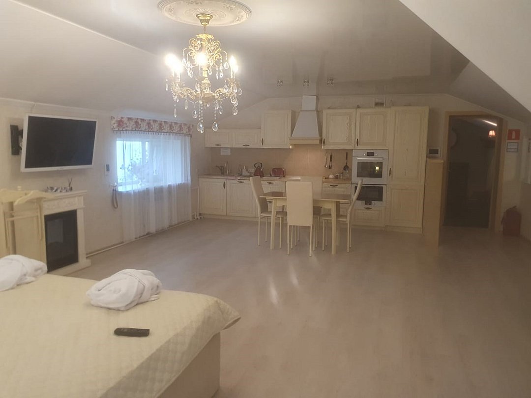 Большой 3-х комнатный номер в романтических бежевых тонах стиля прованс. 120 кв.м. Второй этаж. 3 комнаты на 5 спальных мест. Туалетная комната с биде и ванная комната с большой ванной. Кухонная зона снабжена встроенным холодильником, большим комплектом посуды а так же фильтром для воды, тостером, чайником, сенсорной плитой для приготовления пищи, встроеным духовым шкафом и микроволновой печью, вытяжкой. В обеденной зоне есть теплые полы. А так же king-size кровать и tv зона, свой wi-fi, кондиционер, фен. Много окон, светло и уютно. Отдельный вход.Услуги и удобства