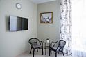 Номера Стандарт выполнены в теплых, пастельных тонах. Оснащение самое современное. В каждом номере сплит система, водонагреватель на случай отключения горячей воды, TV, WI-FI, функция теплый пол, шкаф, плечики, сейф, стол кофейный, 2 стула, санузел в номере, просторный душ, биде, раковина, фен, средства гигиены, постельное белье, полотенца и т.д.Услуги и удобства