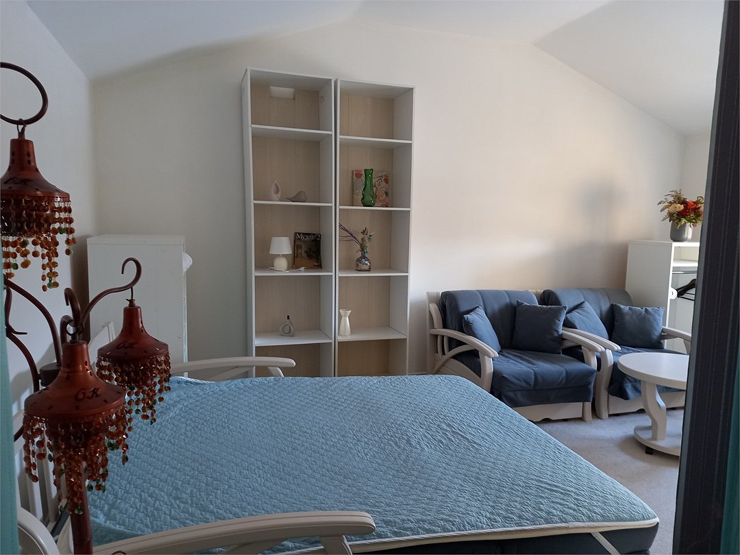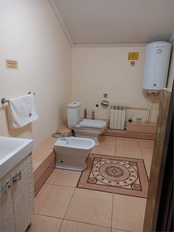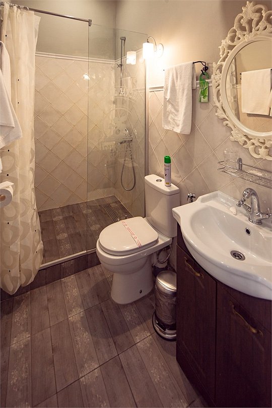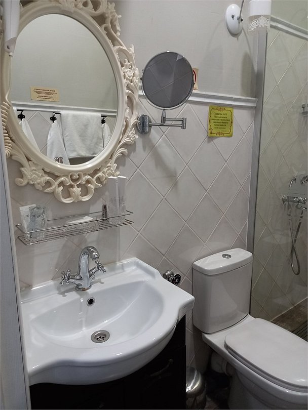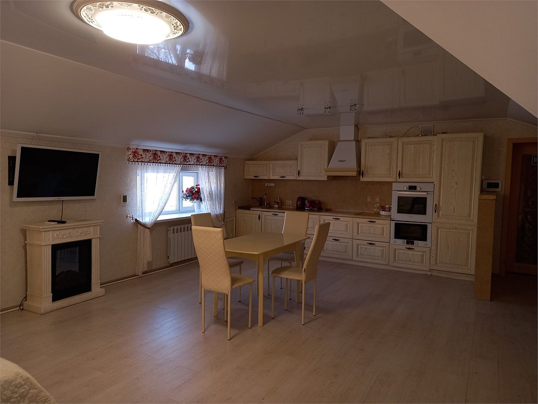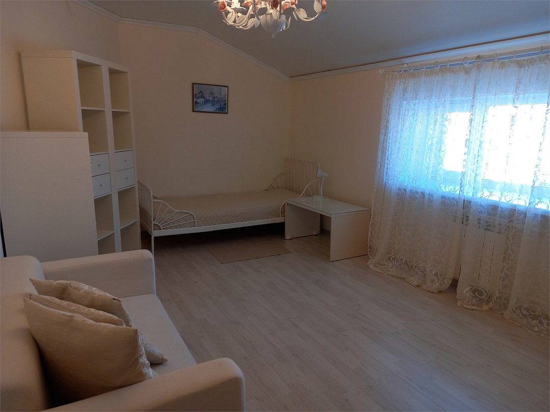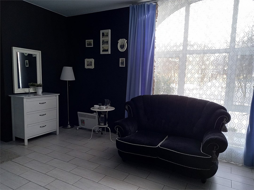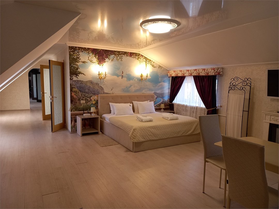 Большой 3-х комнатный номер на 5 спальных мест в романтических бежевых тонах в стиле Прованс площадью 120 кв.м расположен на 2 этаже и имеет отдельный вход. Туалетная комната с биде и ванная комната с большой ванной. В первой комнате-студии размещена кровать размером King-size, обеденная и кухонная зоны. Кухонная зона снабжена встроенным холодильником, комплектом посуды, а так же фильтром для воды, вытяжкой, тостером, чайником, сенсорной плитой для приготовления пищи, встроеным духовым шкафом и микроволновой печью. В обеденной зоне есть теплые полы. Также в номере имеется TV, Wi-Fi, кондиционер, фен. Во второй комнате одна 1,5-спальная кровать и 2 кресла-кровати. В третьей- две 1,5 спальные кровати. В номере много окон, светло и уютно.Услуги и удобства