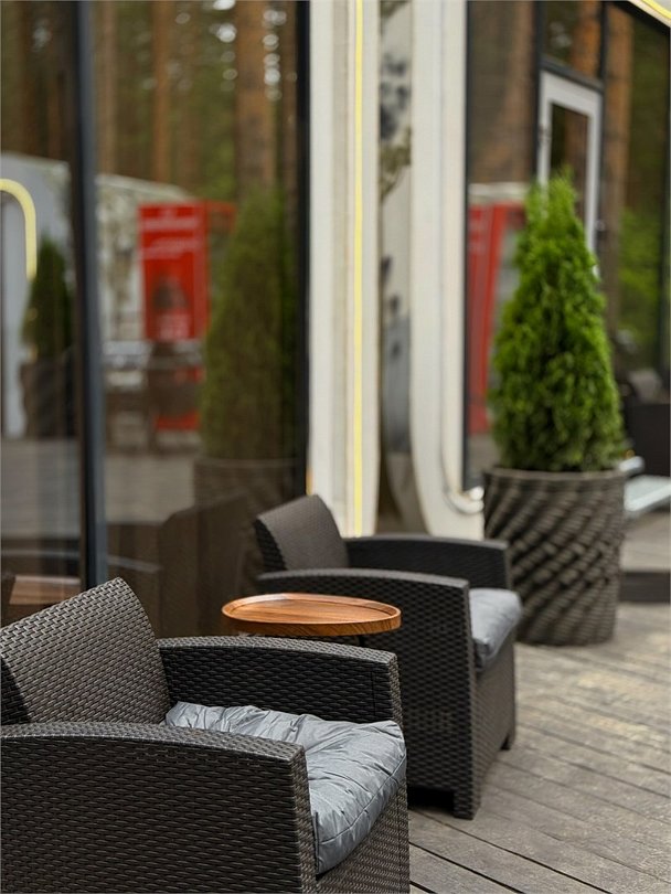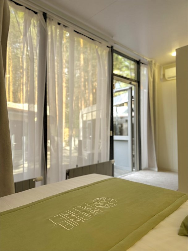Wi-Fi, кондиционер, фен, электронные замки, санузел, халаты, банные полотенца, тапочки, двуспальная кровать, шкаф для одежды, вешалки, журнальный столик, чайник, раковина, питьевая вода, ковровое покрытие, отопление, душ, панорамные окна, раскладное кресло, внутренний телефон, мини-холодильник, мини-кухня, номер для некурящих, проектор, фумигатор, уборка номера, бутилированная вода, шапочка для душа, окна от пола до потолка, уличная мебельВ домике