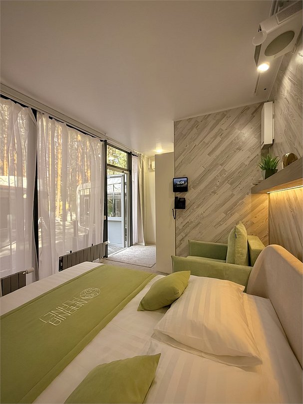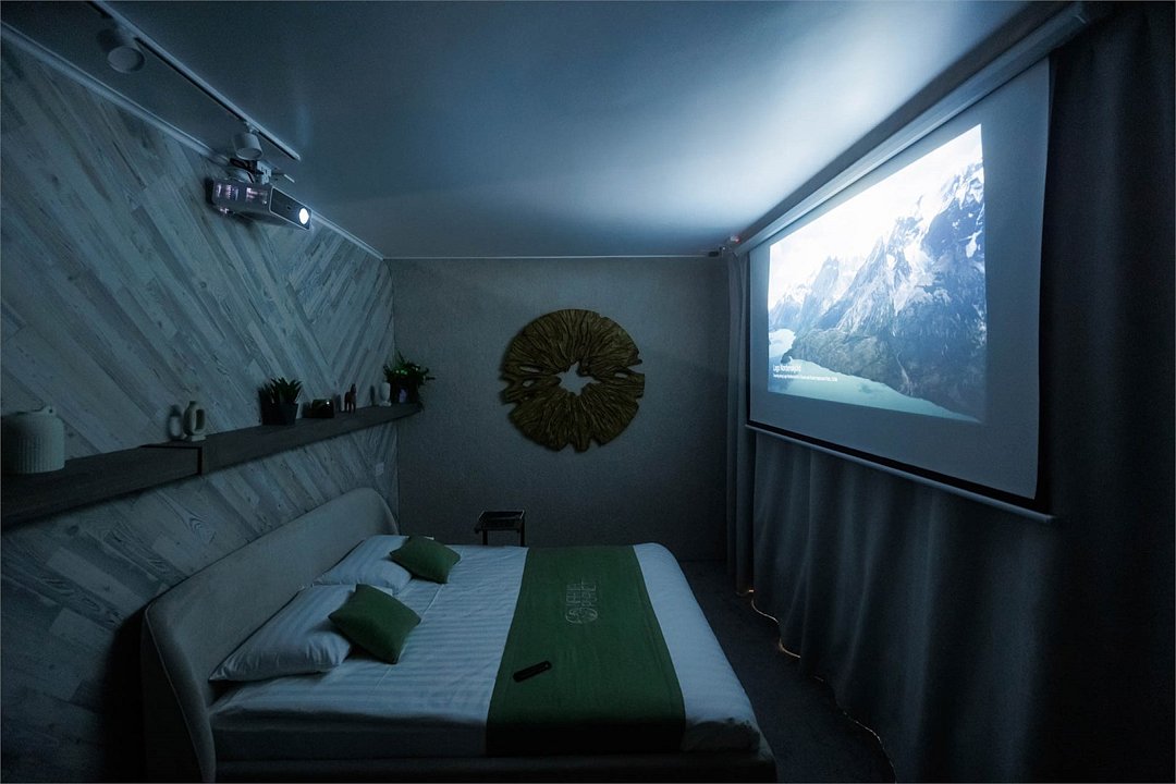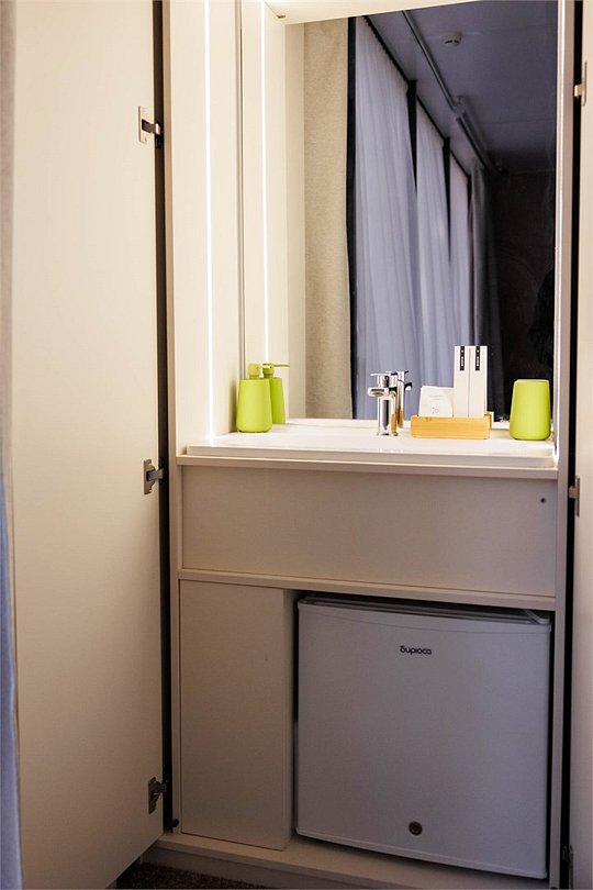 Просторная капсула общей площадью 13.5 кв.м. отлично подойдут как для пар, так и для комфортного одноместного размещения. Каждая капсула оборудована сплит системой., мини холодильником. Вместо TV, проектор. Ванная комната имеет все, что нужно для комфортного отдыха: душевую кабину, фен, средства личной гигиены. Комплимент от отеля - бутилированная вода, кофе, чай, сахар в номере.Услуги и удобства