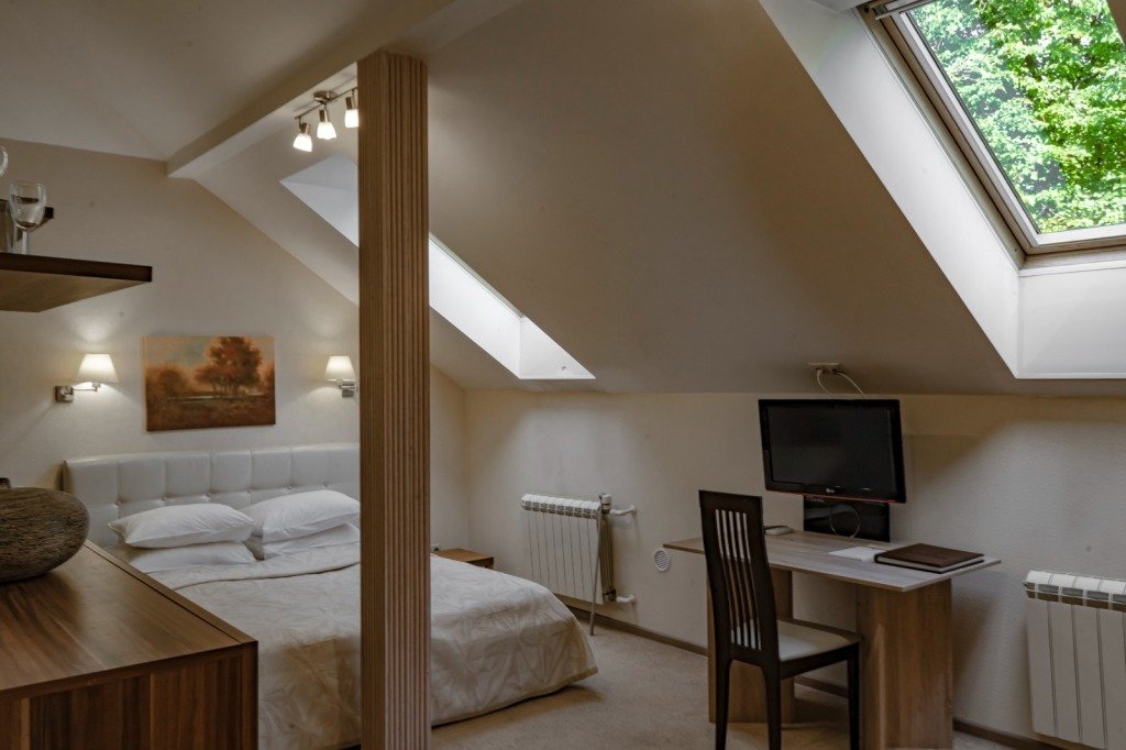 телевизор, кабельное телевидение, Wi-Fi, интернет, кондиционер, фен, электронные замки, обогреватель, душевая кабина, ванна, санузел, халаты, банные полотенца, тапочки, косметические средства, двуспальная кровать, шкаф для одежды, вешалки, журнальный столик, письменный стол, багажная тумба, зеркало, комод, чайник, раковина, кулер на этаже, кресло, стаканы, кофейный столик, тумба, раскладной диван, мини-холодильник, мансардные окна, холодильный шкафВ номере