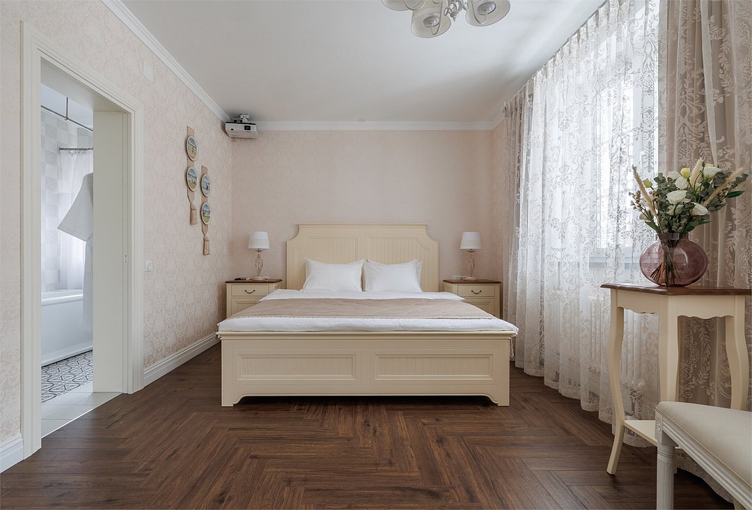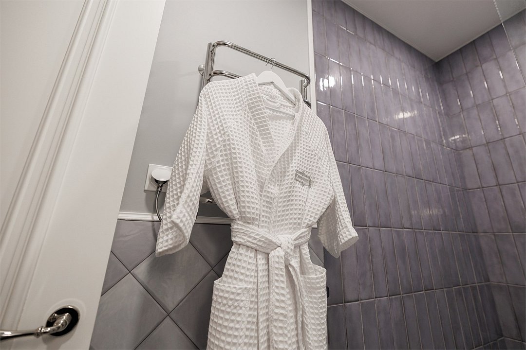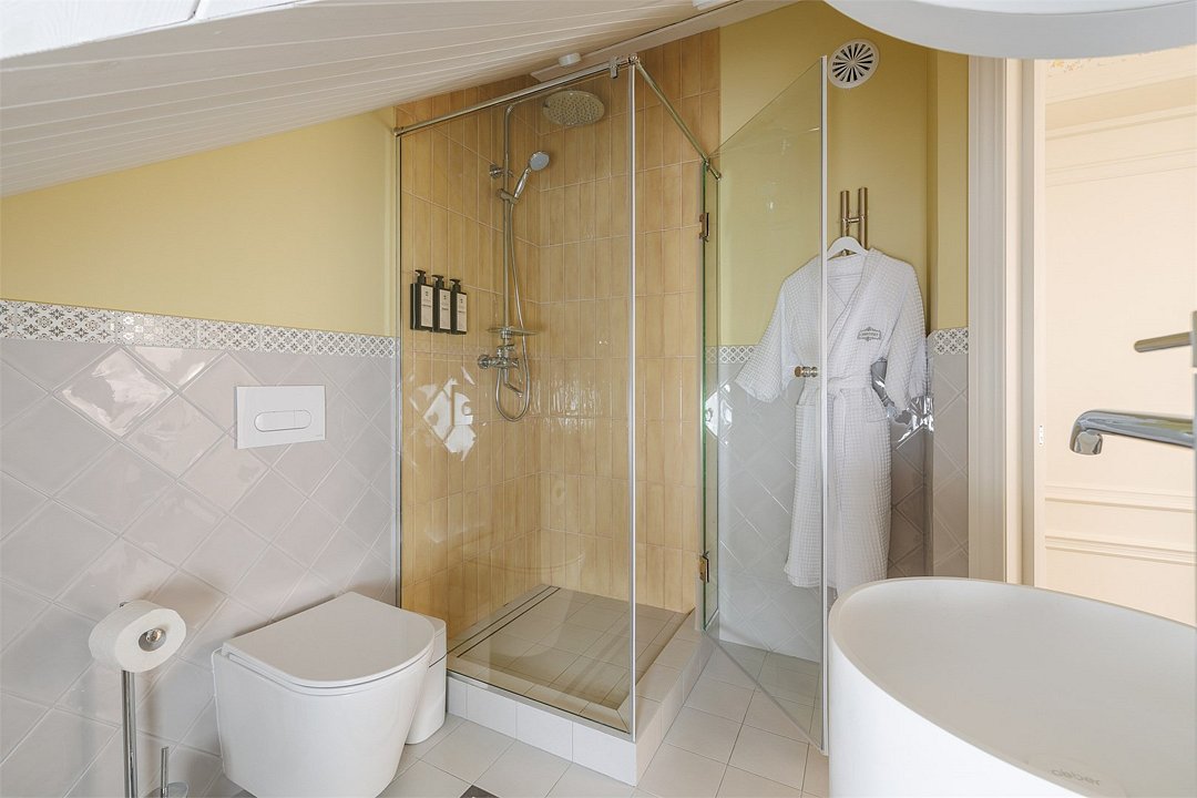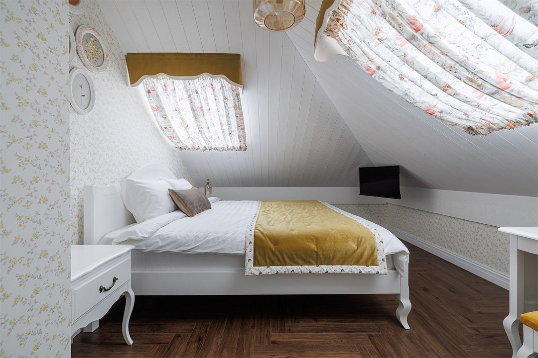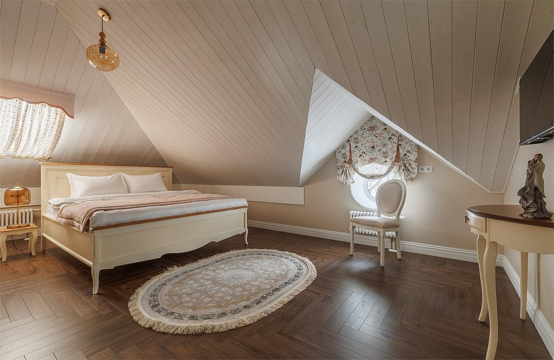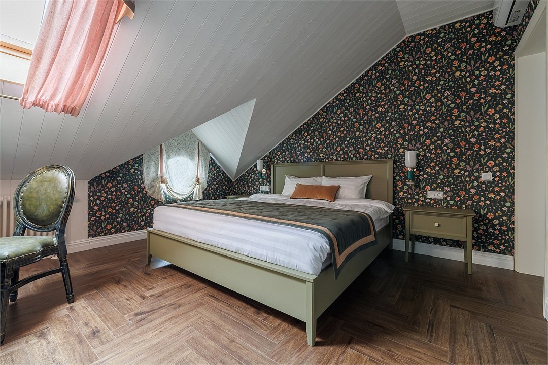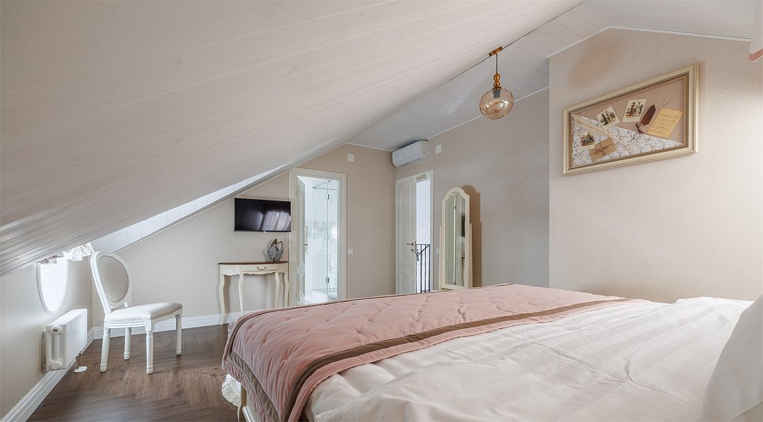 телевизор, Wi-Fi, кондиционер, светильник, фен, душевая кабина, банные принадлежности, халаты, банные полотенца, тапочки, косметические средства, кровать «Queen size», тумбы, зеркало, эксклюзивная мебель, унитаз, раковина, отопление, вид на город, паркет, стул, туалетный столик, москитная сетка, мансардные окна, телевизор со Smart TV, номер для некурящих, уборка номера, туалетные принадлежности премиум-класса, бутилированная вода, шапочка для душа, мылоВ гостиничном номере