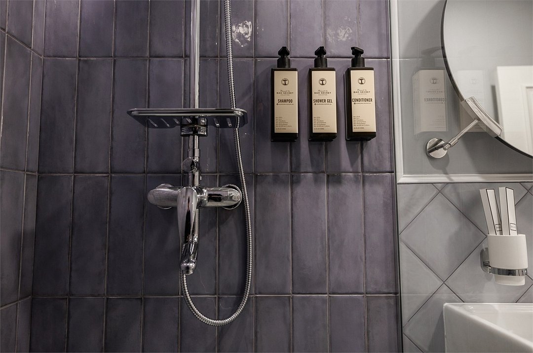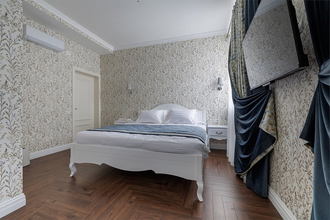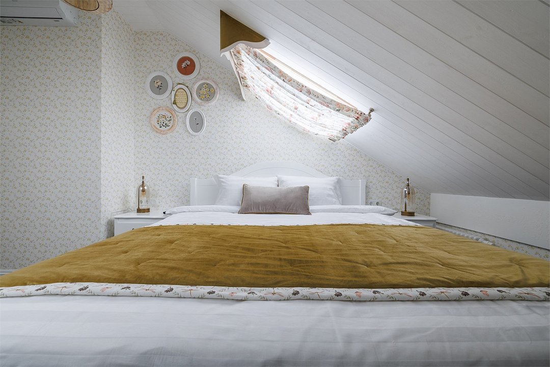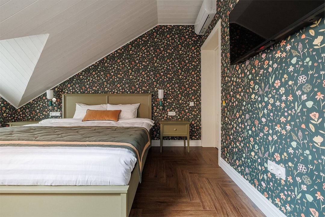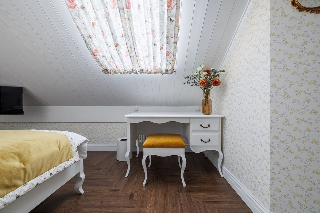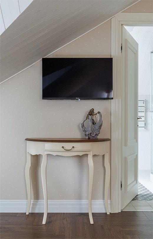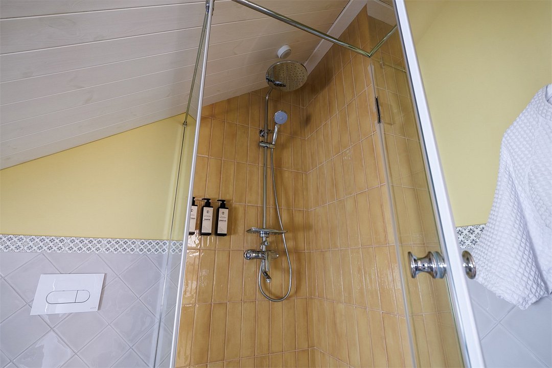 телевизор, Wi-Fi, кондиционер, светильник, фен, душевая кабина, банные принадлежности, халаты, банные полотенца, тапочки, косметические средства, кровать «Queen size», тумбы, зеркало, эксклюзивная мебель, унитаз, раковина, отопление, вид на город, паркет, стул, туалетный столик, москитная сетка, мансардные окна, телевизор со Smart TV, номер для некурящих, уборка номера, туалетные принадлежности премиум-класса, бутилированная вода, шапочка для душа, мылоВ гостиничном номере