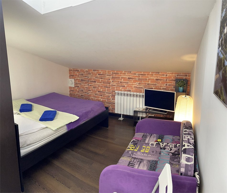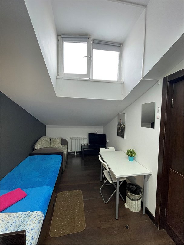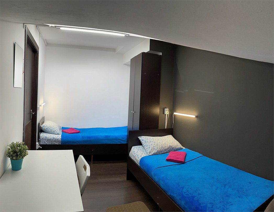 кабельное телевидение, Wi-Fi, интернет, светильник, фен, вентилятор, система безопасности, обогреватель, две односпальные кровати, гладильная доска, стулья, шкаф для одежды, вешалки, зеркало, кулер на этаже, общая ванная комната, ламинат, стол, санузел на этаже, цифровое тв, телевизор с плоским экраном, мансардные окнаВ гостиничном номере