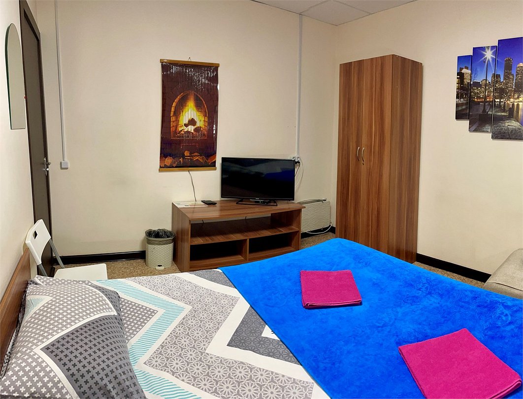 спутниковое телевидение, Wi-Fi, интернет, светильник, фен, вентилятор, система безопасности, обогреватель, односпальная кровать, гладильная доска, стулья, шкаф для одежды, вешалки, зеркало, вид на город, кулер на этаже, общая ванная комната, санузел на этаже, сушилка для белья, телевизор с плоским экраном, кресло-кроватьВ гостиничном номере