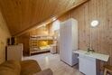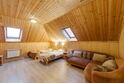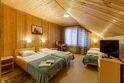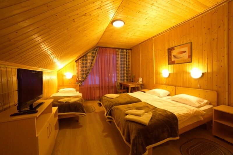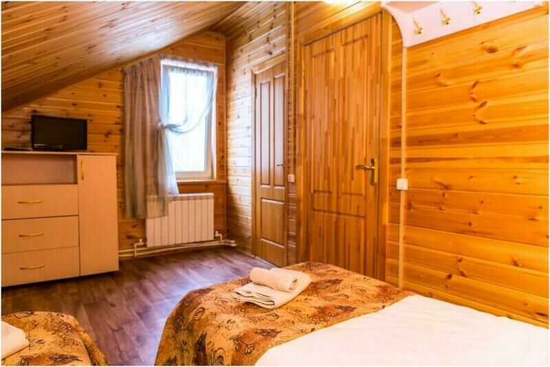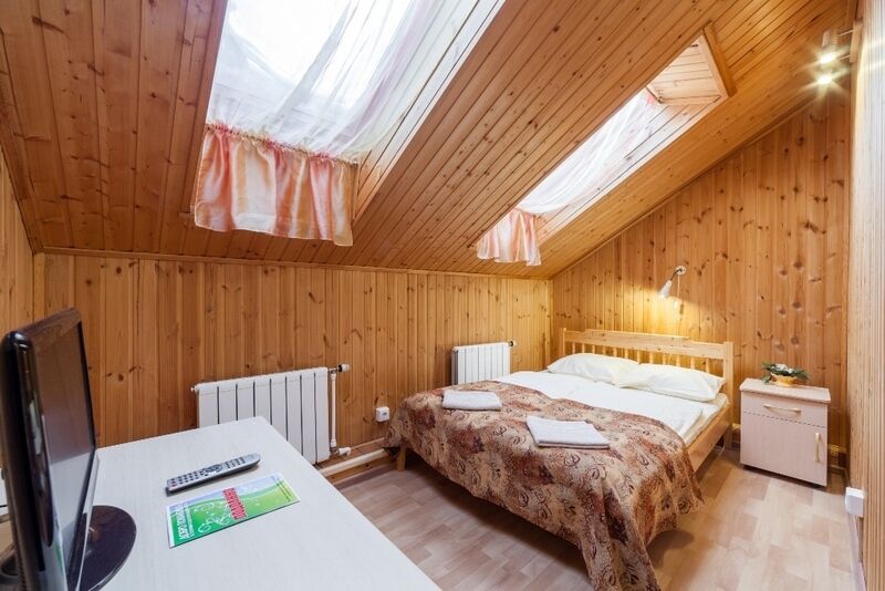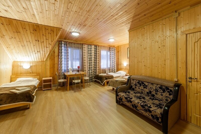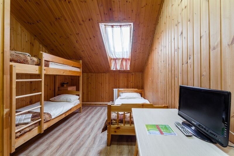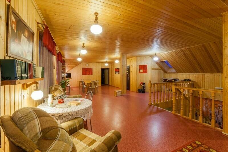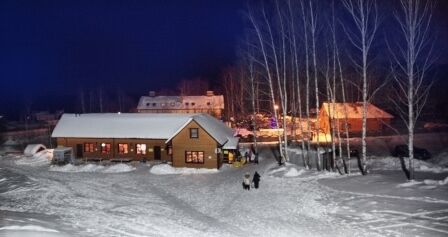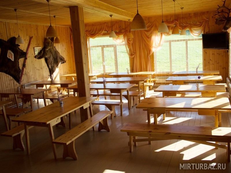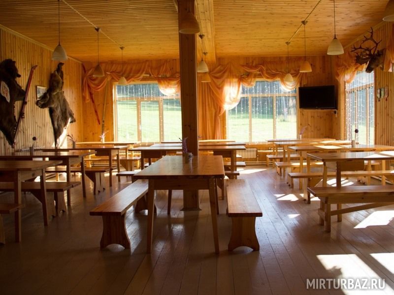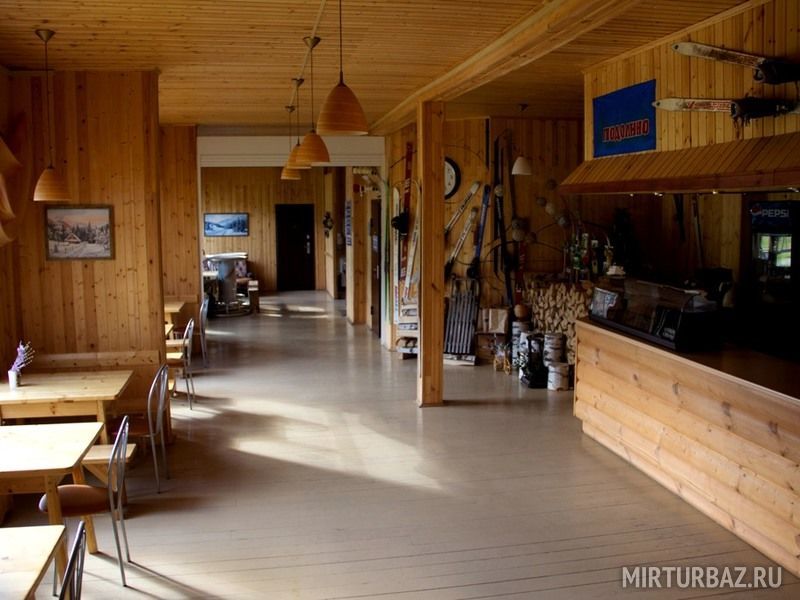 В гостевом доме у горнолыжного склона расположено третье кафе. Уютная домашняя атмосфера, просторный зал и деревянный интерьер с использованием охотничьей атрибутики позволят вам отдохнуть и подкрепиться после катаний на горнолыжном склоне.