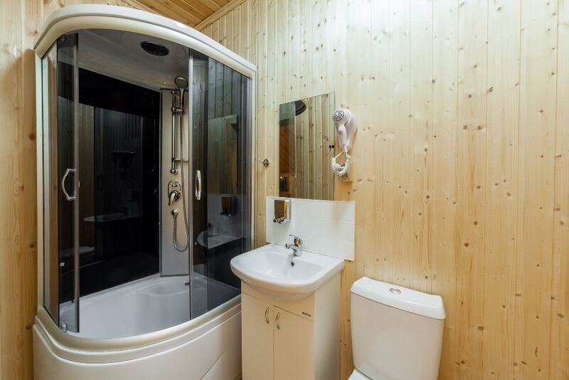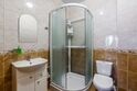 Санузел в номере включает в себя душевую кабину, унитаз, раковину.