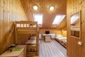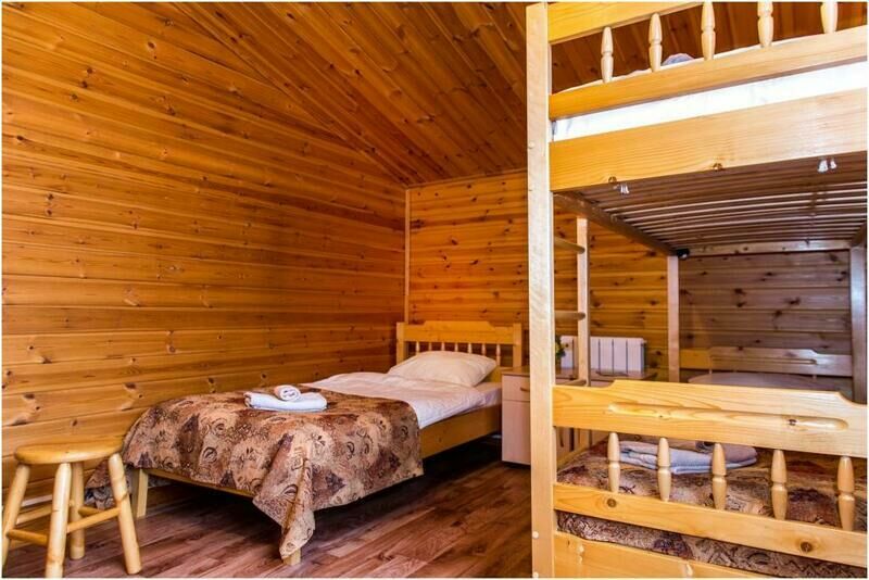 Двуспальная кровать и 2-х ярусная кровати с санузлом в номере