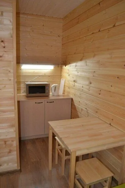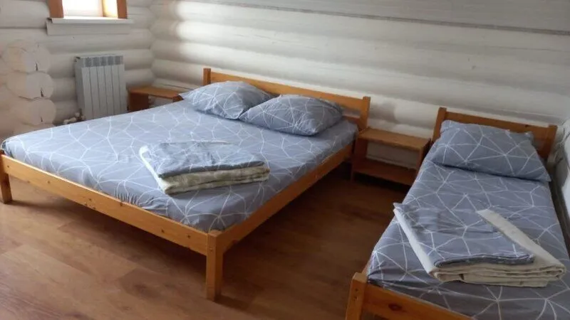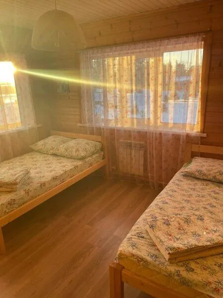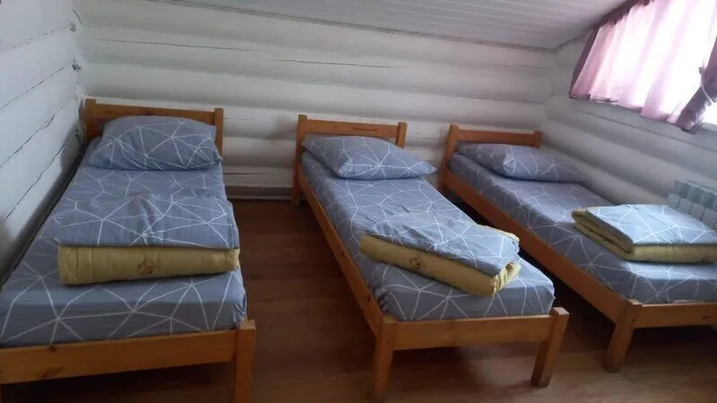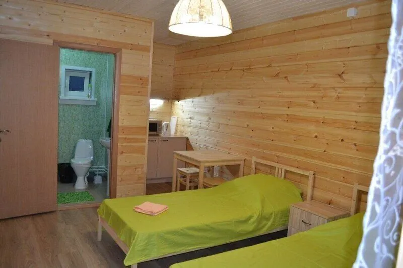 На территории базы отдыха имеется маленькая гостиница с тремя двухместными удобными номерами. Два номера с двуспальными кроватями и один с двумя односпальными. Есть все необходимое: сан. узел с душевой кабиной, постельное белье, полотенца, одеяла, 2 тумбочки, вешалка, кухонный уголок с микроволновкой и чайником, необходимая посуда, стол и табуретки. У каждого номера есть небольшое уютное кресло.
