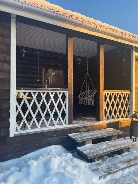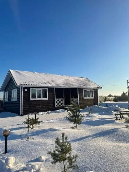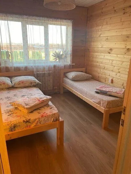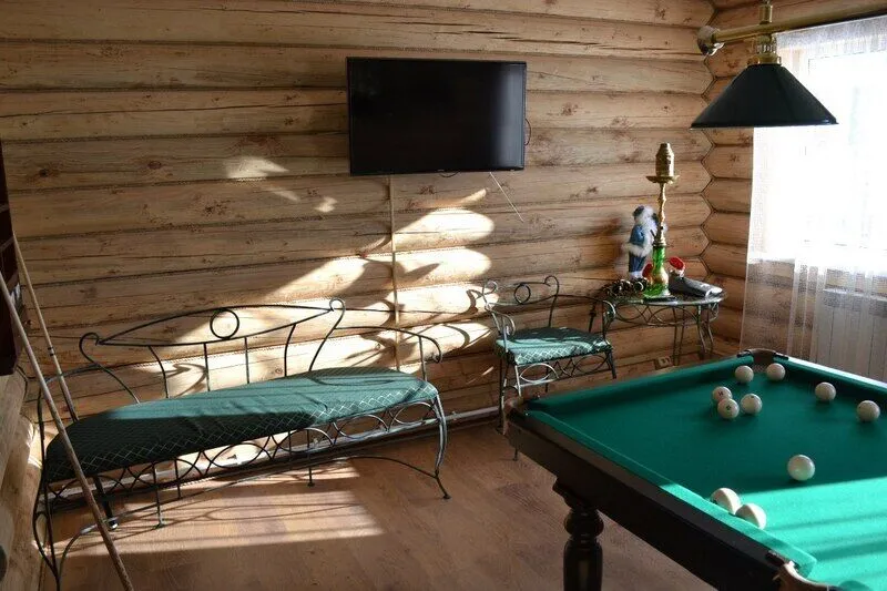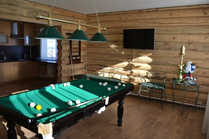 Небольшой двухэтажный дом, рассчитанный на 8 спальных мест. Располагает двумя спальнями, двумя сан. узлами, оборудованной кухней с большим столом и лавками, так же имеется бильярд.