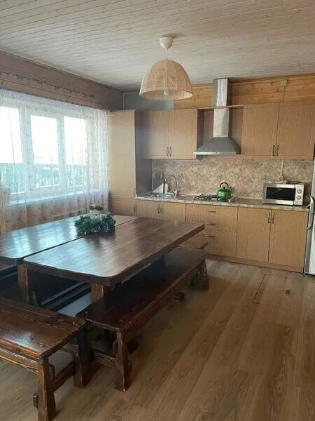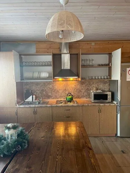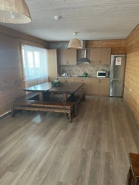 Дом рассчитан на 12 спальных мест. Имеет кухню-столовую с большими столами и лавками, телевизором, музыкальным центром с цветомузыкой, полностью оборудованной кухней, с посудой для сервировки на 20 персон. Так же в доме есть сан. узел с душевой кабиной и три спальни.