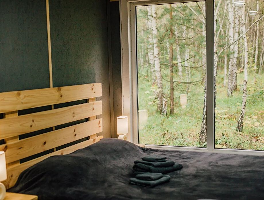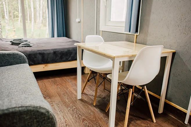 Жилой фонд включает одно- и двухкомнатные домики, рассчитанные на 2 и 4 гостя соответственно. Все коттеджи имеют похожую комплектацию: в наличии двуспальная кровать, диван, кухонное пространство, санузел с душем, панорамные окна, открытая терраса с летней мебелью. Четырехместные дома дополнены 2 односпальными кроватями. Можно приехать с питомцем мелкой породы.