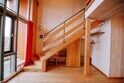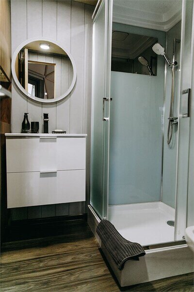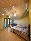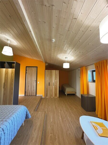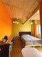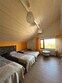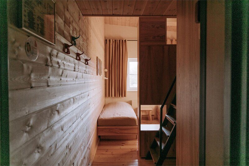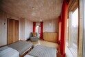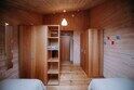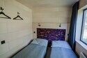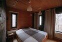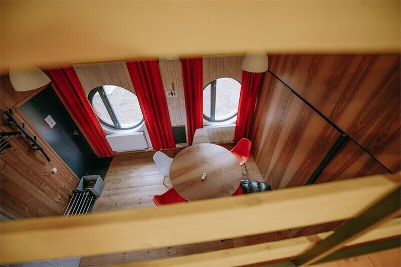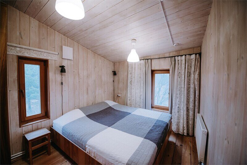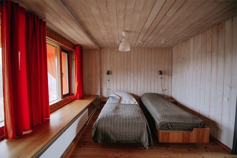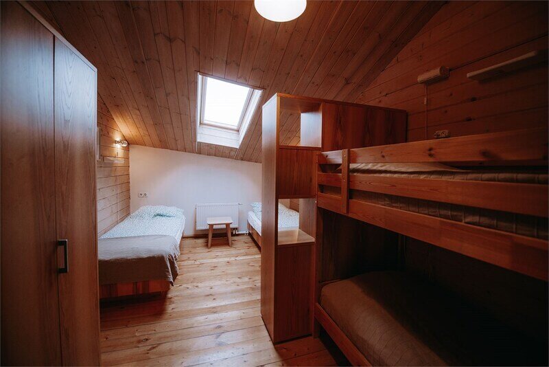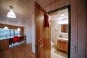 Стандартный номер на 4-х гостей имеет всего одну двуярусную кровать, отделенную шкафом-перегородкой от двух односпальных кроватей у мансардного окна. Все номера выполнены в дереве, имеют достаточно мест для размещения вещей во встроенных шкафах, у каждого спального места есть своя подсветка, полочка для подзарядки гаджетов.