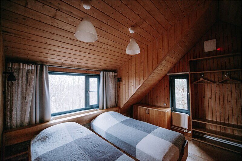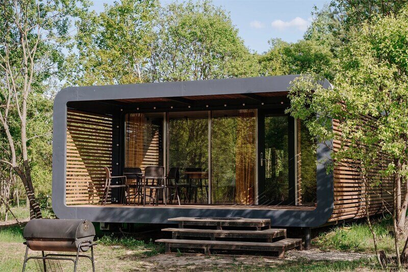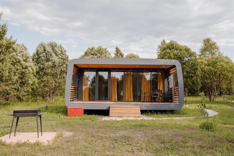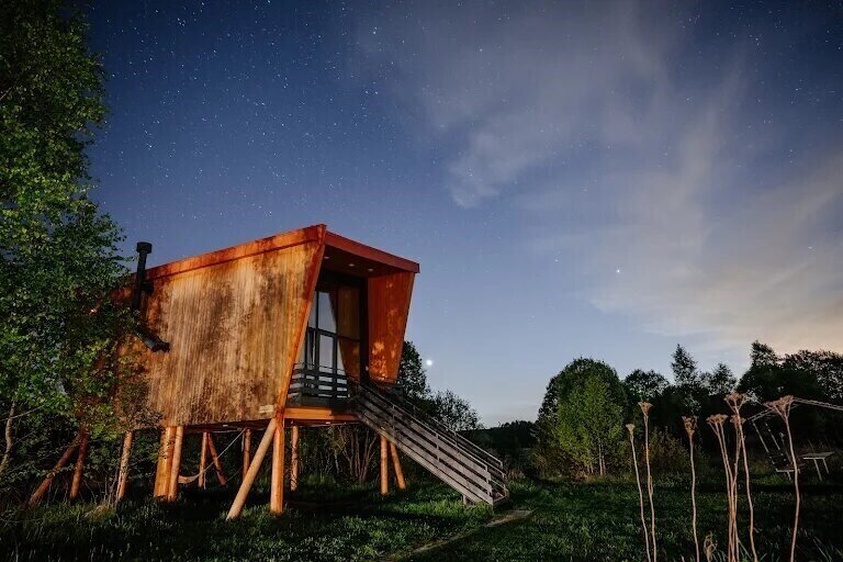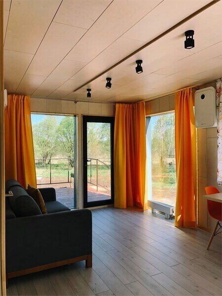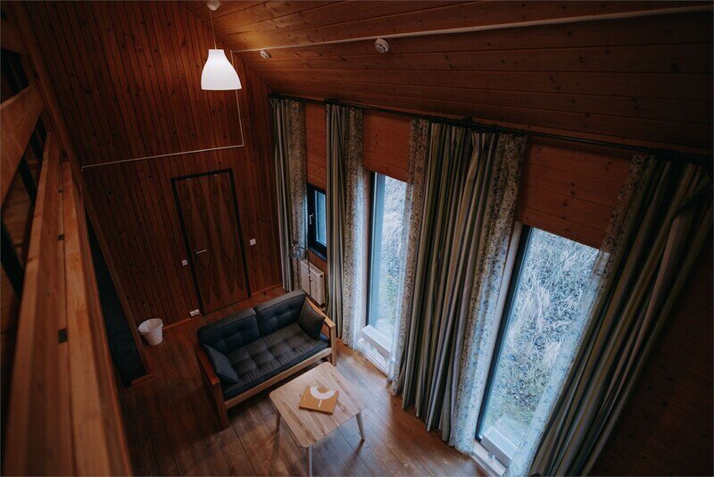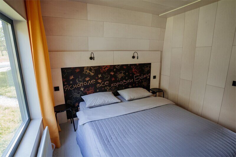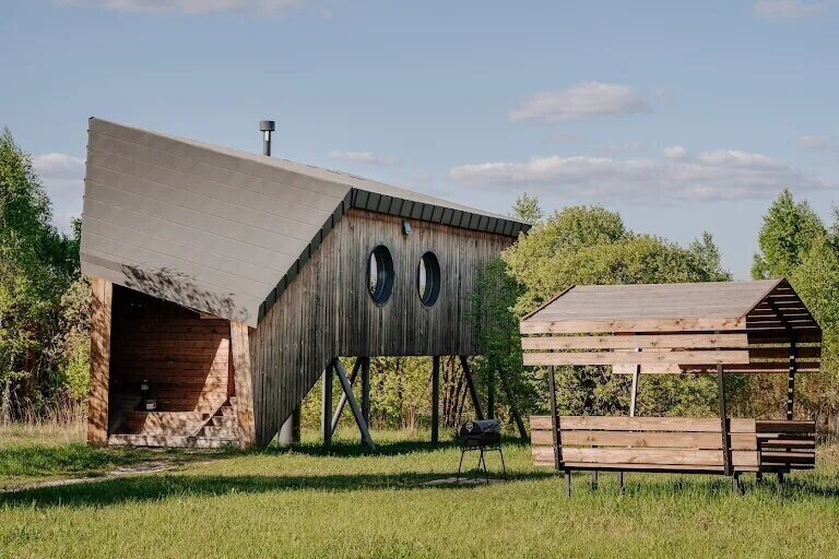Компактные авторские архитектурные дома с панорамным видом на лес. В доме две двуспальные кровати на 2 уровнях, зона гостиной, оборудованная кухня, санузел с душем, утюг, гладильная доска.