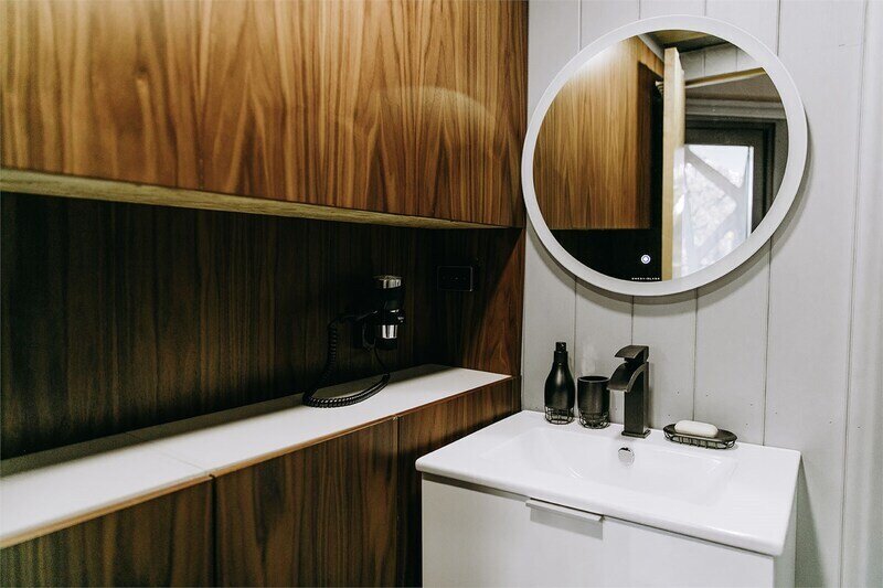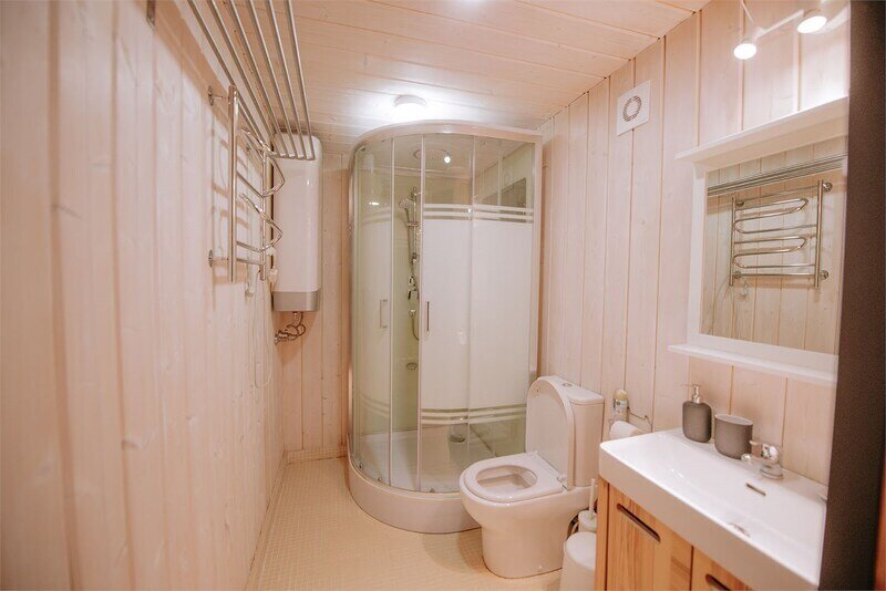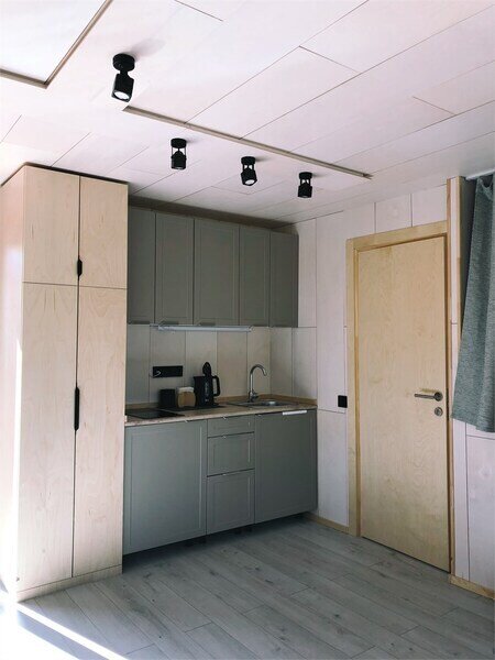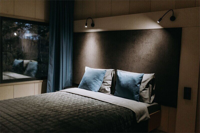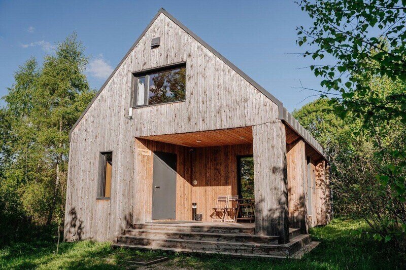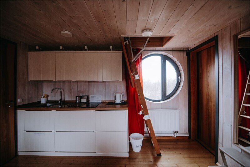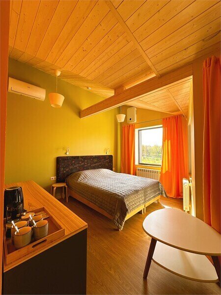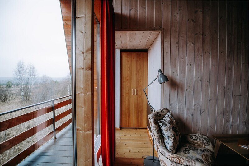 Компактные авторские архитектурные дома с панорамным видом на лес. В доме две двуспальные кровати на 2 уровнях, зона гостиной, оборудованная кухня, санузел с душем, утюг, гладильная доска.