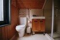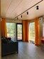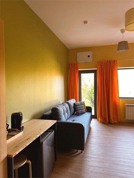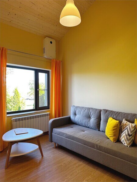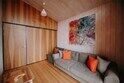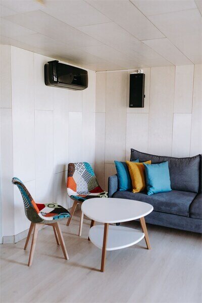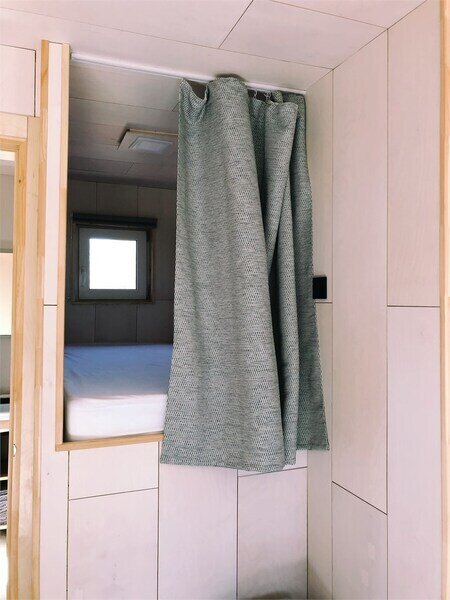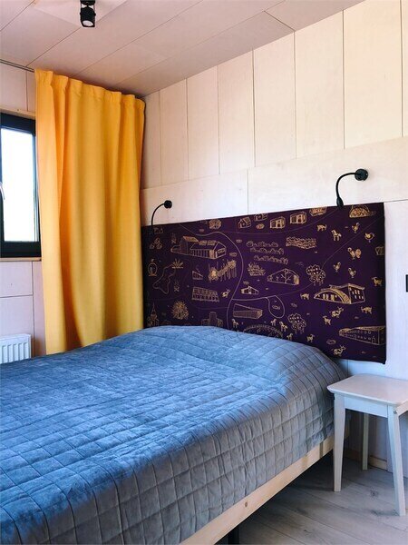Одноэтажный компактный модульный дом с террасой имеет гостиную с оборудованной кухней, спальню, санузел с душем. В спальне - одна двуспальная кровать и большой шкаф для одежды. В зоне гостиной – диван на два спальных места и кресло. В доме есть утюг и гладильная доска.