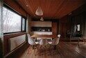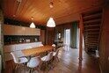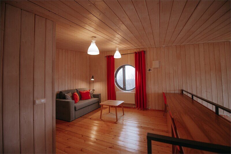 В каждом доме - гостиная с кухней и большим столом, а также две спальни. Одна из спален - с диваном-кроватью и креслом-кроватью- отгорожена трансформируемой стеной, что позволяет объединить пространство спальни и создать большую гостиную с панорамным окном. Вторая – отдельная спальня – допускает два варианта расстановки кроватей: две односпальные кровати или одна большая кровать.