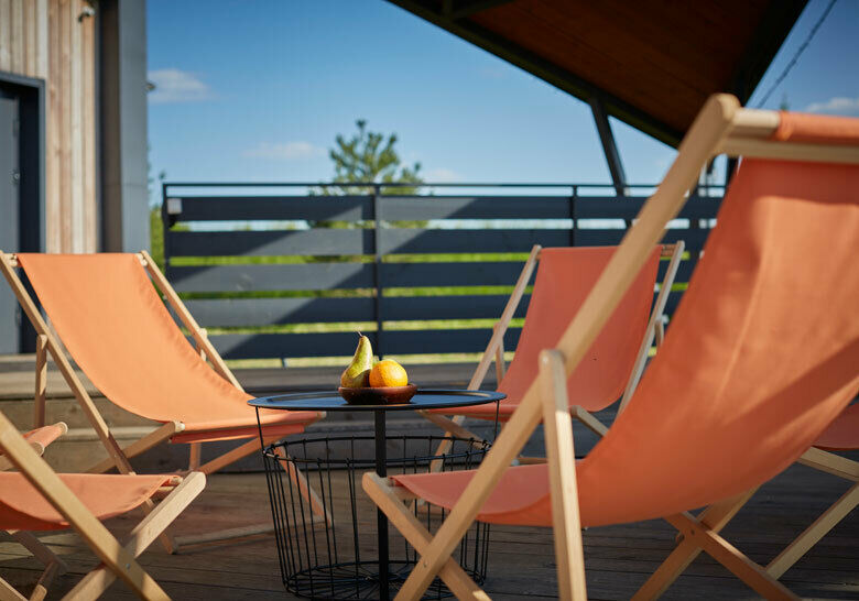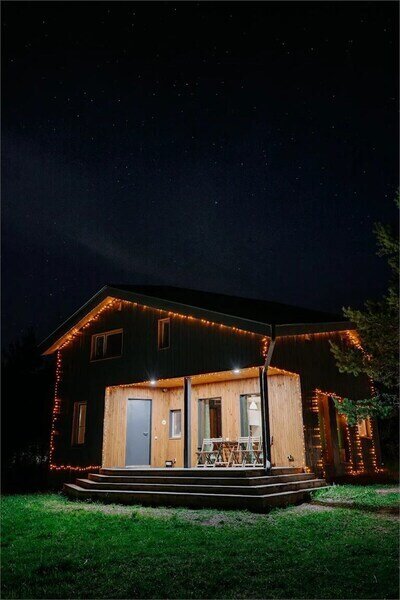 Одноэтажный компактный модульный дом с террасой и панорамным окном-стеной. В доме: гостиная с диваном-кроватью, креслами, журнальным столом и оборудованной кухней, две отдельных спальни с двуспальными кроватями. Удобства: 1 отдельный с\у с душем, утюг, гладильная доска.