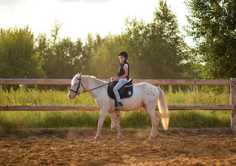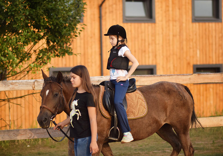 Обучение верховой езде. Это занятие рассчитано на развитие равновесия, снятие боязни высоты и скованности детей при первых опытах верховой езды.
