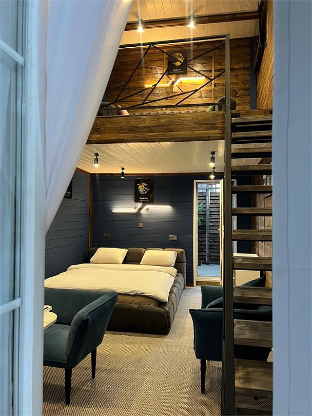Просторный двухуровневый номер делюкс представляет собой отдельно стоящий домик. В нём есть все необходимое, чтобы вы чувствовали себя как дома. Он отличается особой атмосферой уюта и простором за счет высоких потолков, а интерьер создан с любовью и вниманием к деталям.
