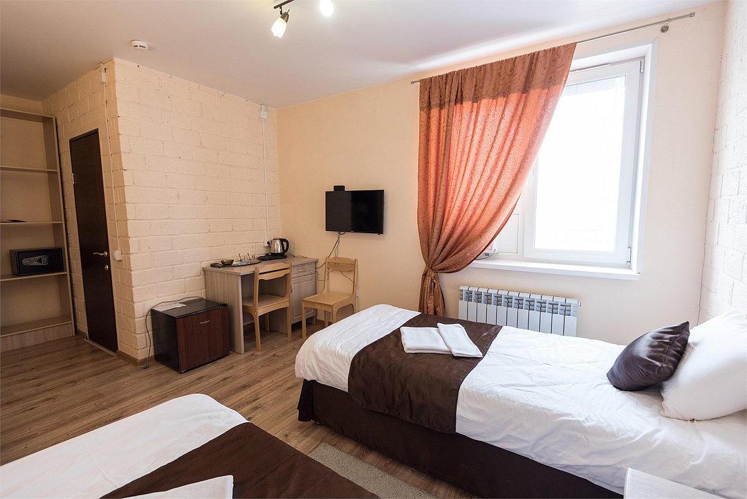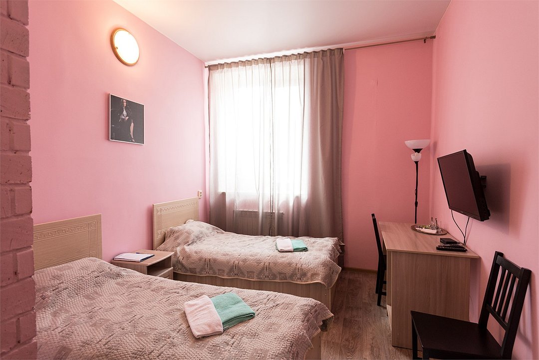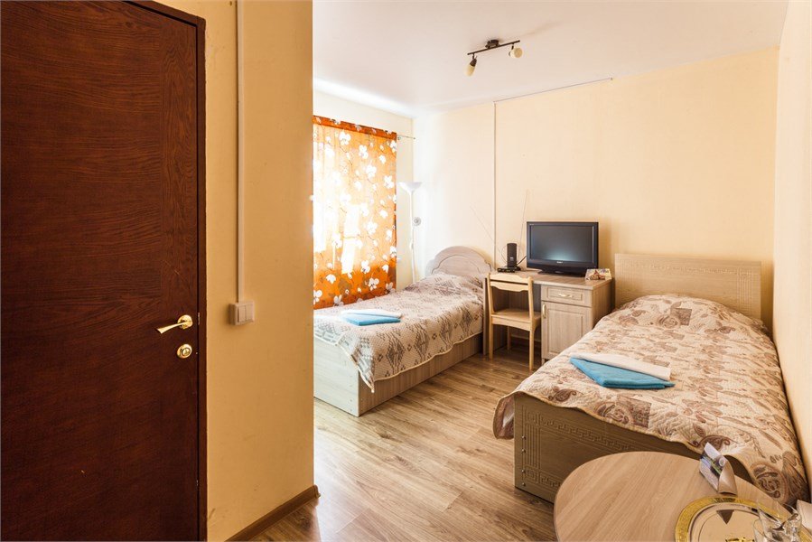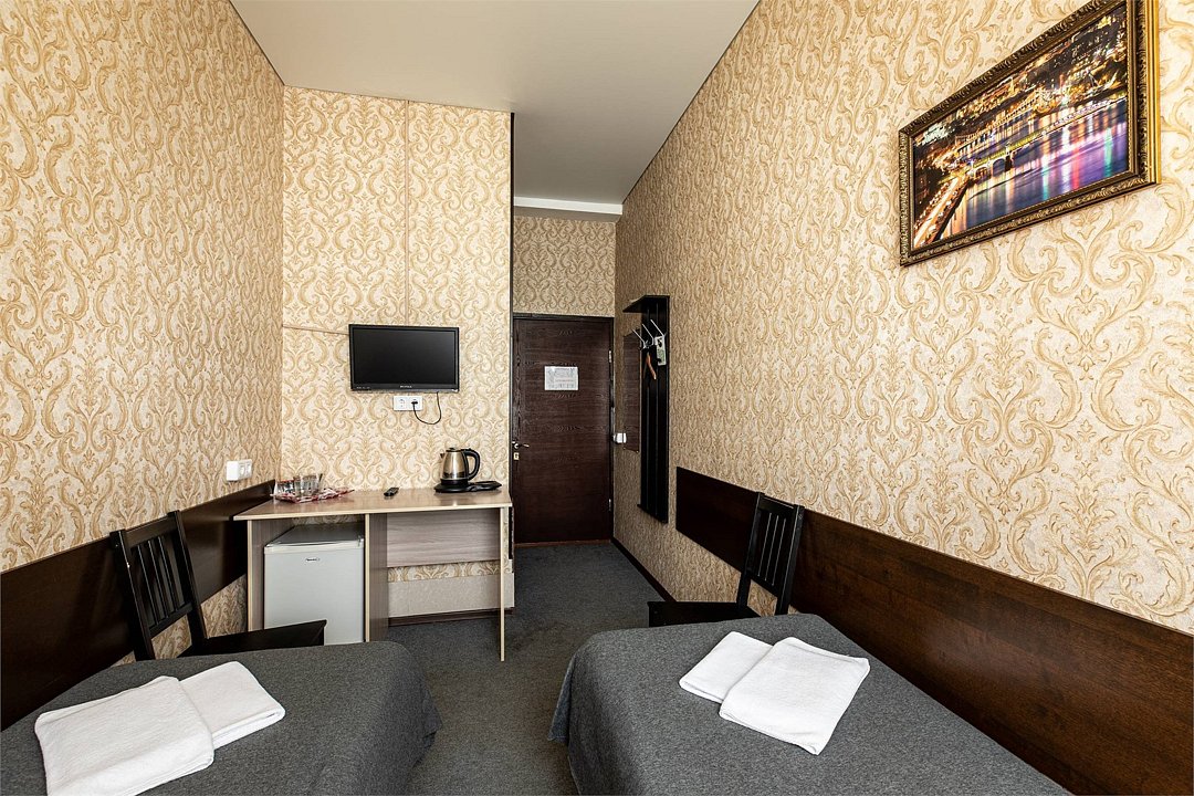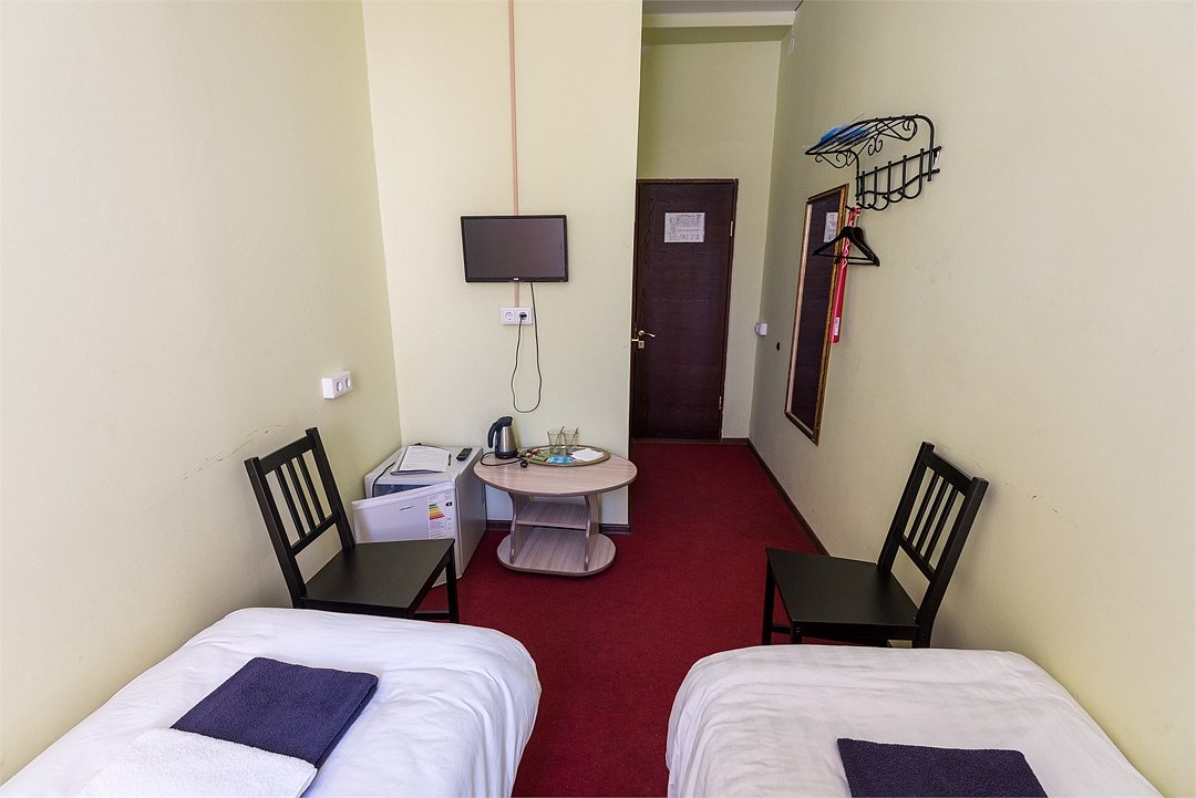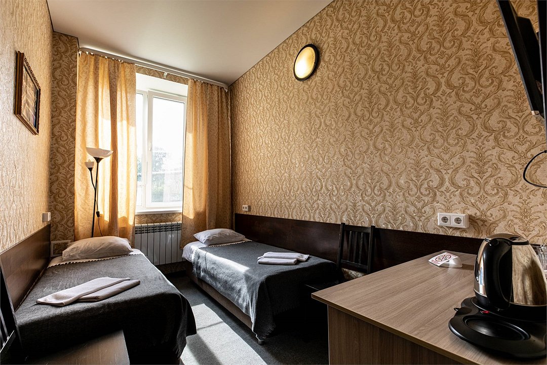 Современный однокомнатный номер. В номере две односпальные кровати, телевизор, холодильник, рабочий стол, чайник, ванная комната с душевой кабиной и косметическими средствами. Окна номеров выходят во двор.Услуги и удобства