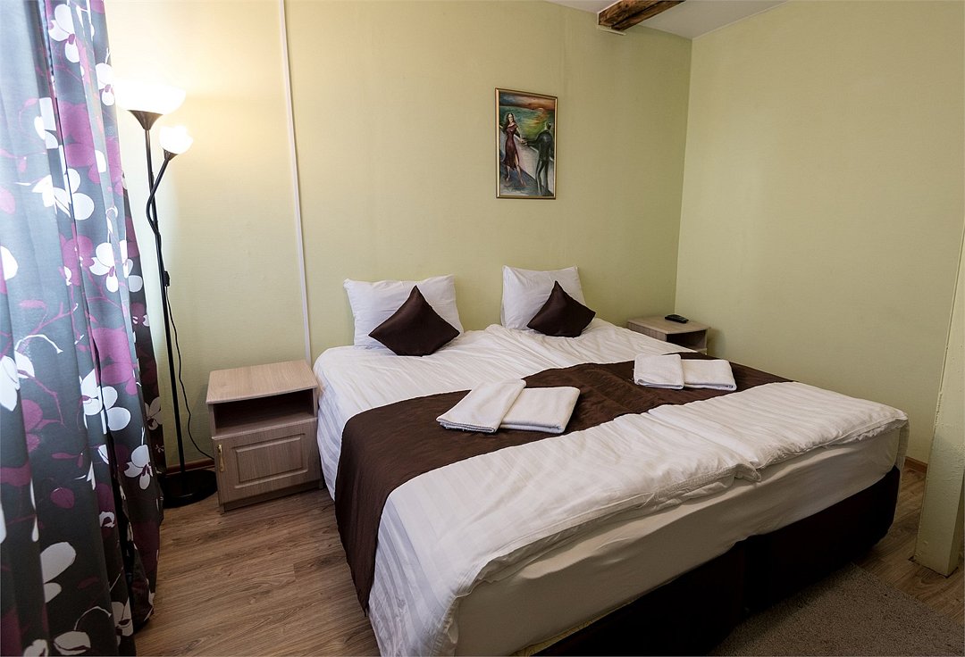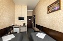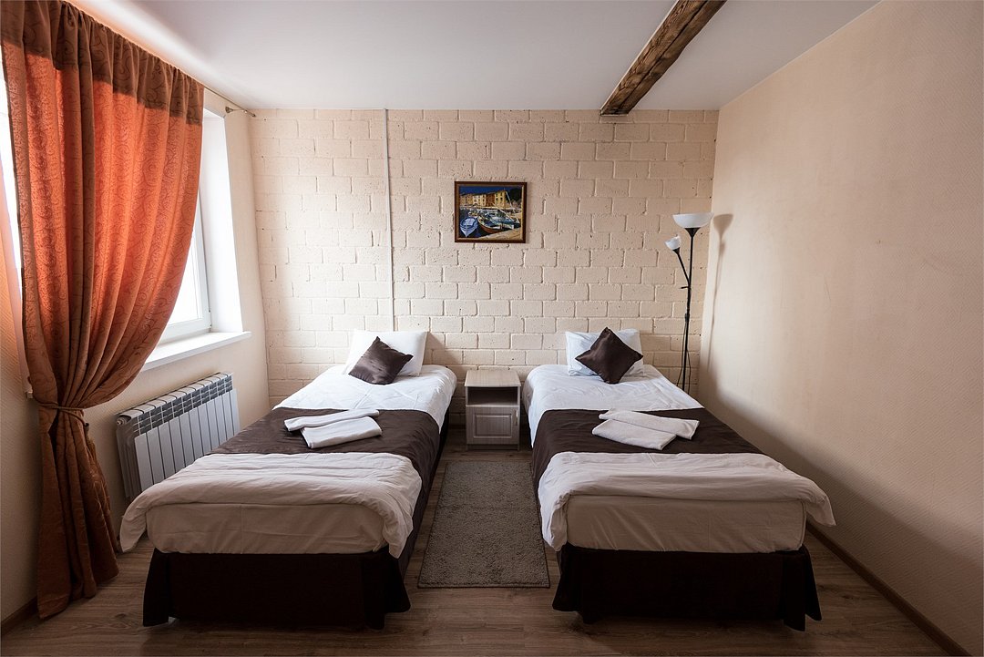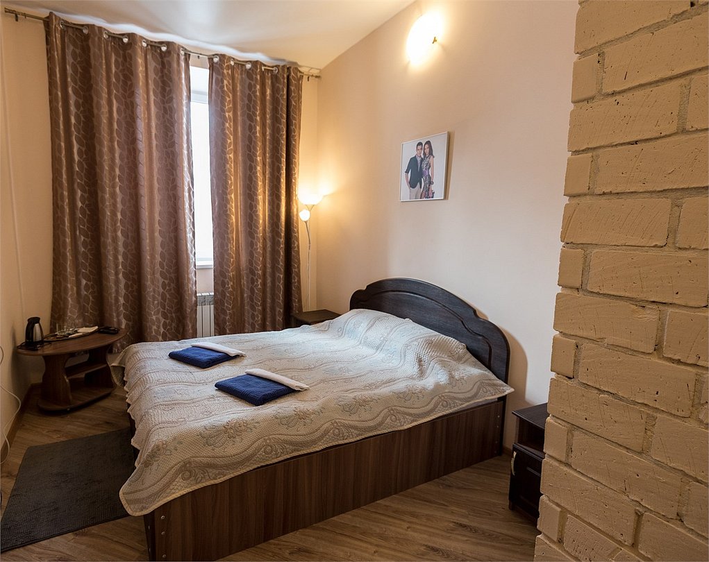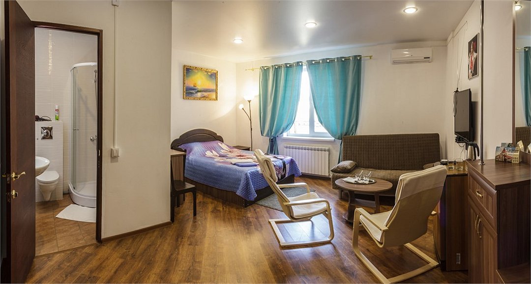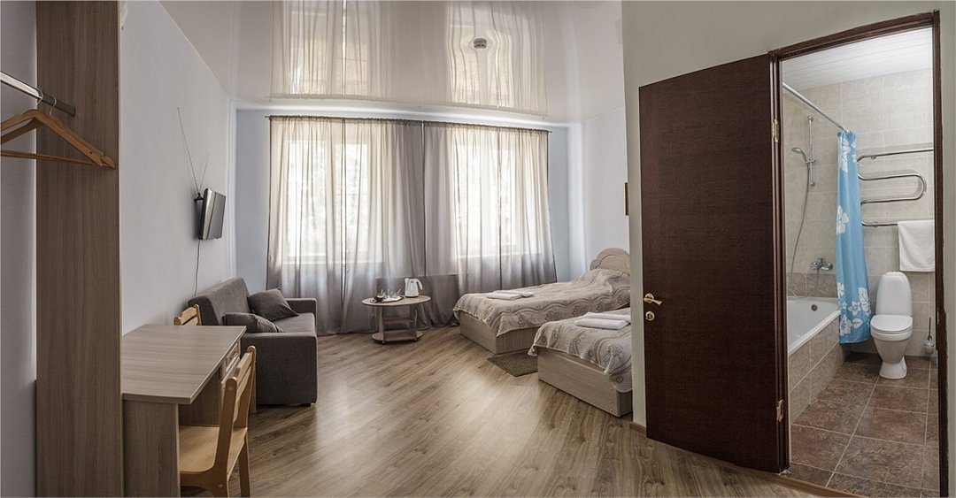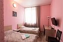 Современный однокомнатный номер. В номере две односпальные кровати, телевизор, холодильник, рабочий стол, чайник, ванная комната с душевой кабиной и косметическими средствами. Окна номеров выходят во двор.Услуги и удобства