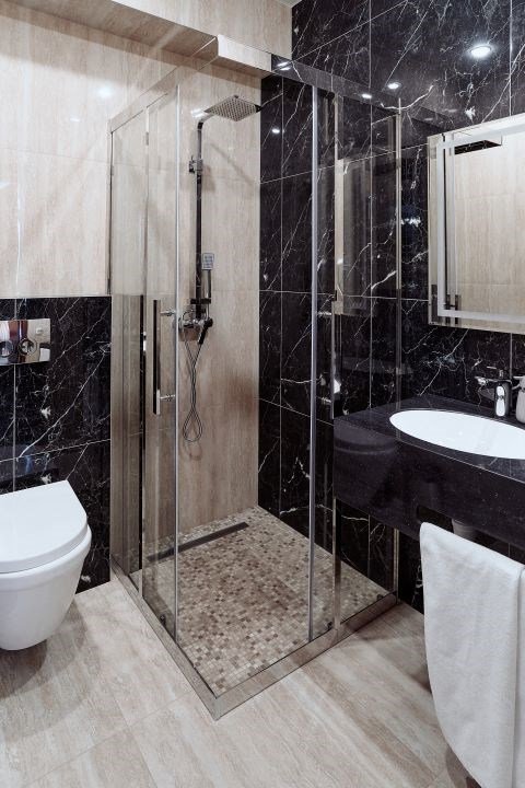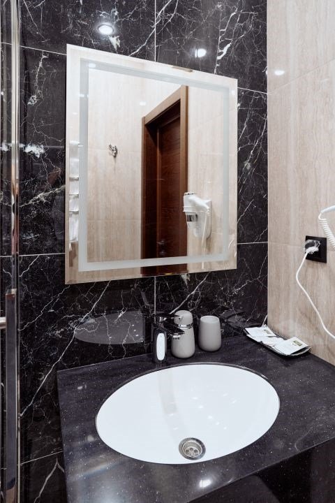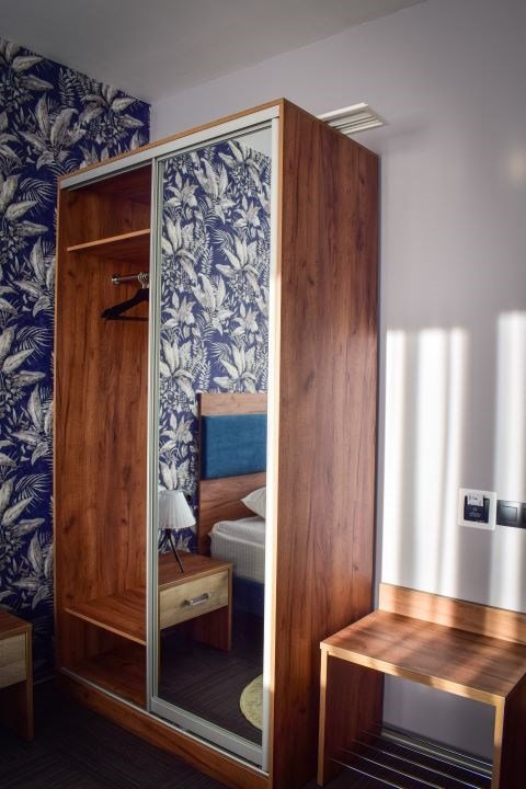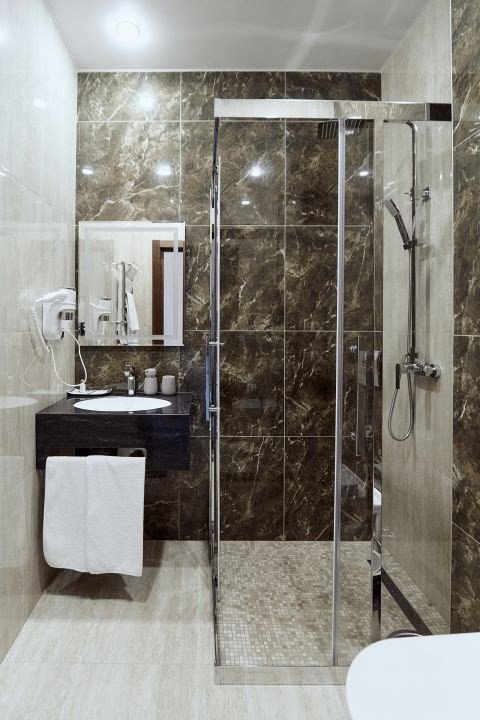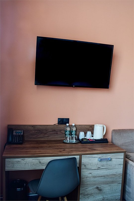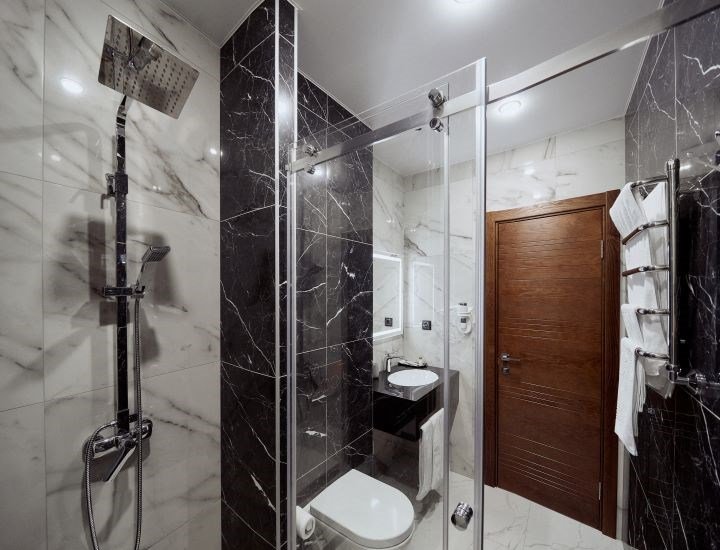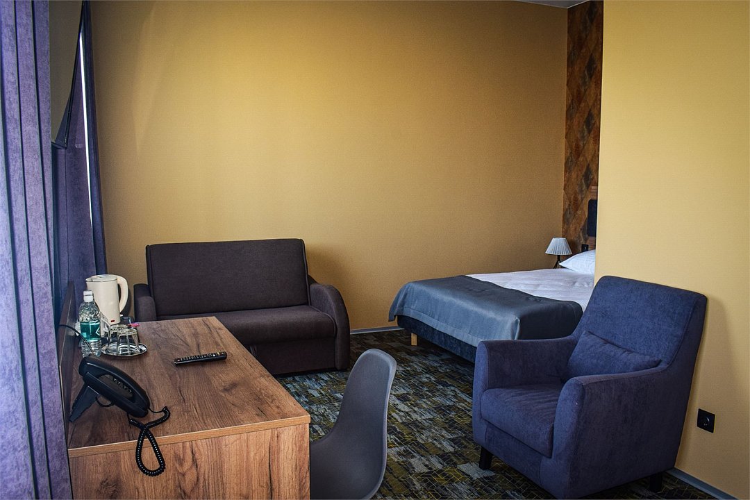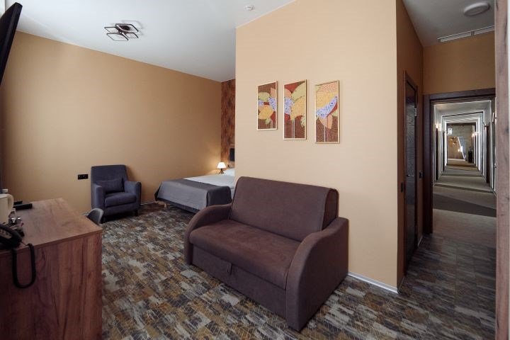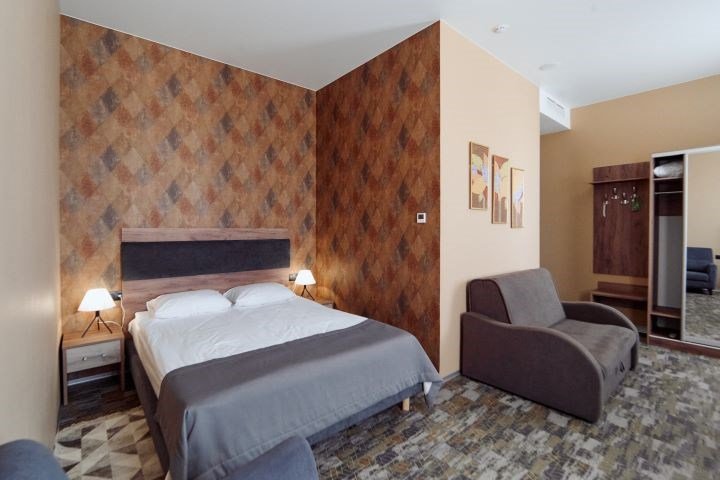 Улучшенный однокомнатный номер площадью от 23 м2 с одной большой кроватью King Size 160 x 200 и дополнительной диван-кроватью, кондиционером, электрическим чайником и телевизором диагональю 43 дюйма. Этот просторный и уютный номер отлично подойдет для деловых поездок на длительный период, и конечно же, для отдыха с семьей. Это идеальный выбор для проживания с максимальным комфортом. Номер оснащен душевой кабиной с тропическим душем.Услуги и удобства