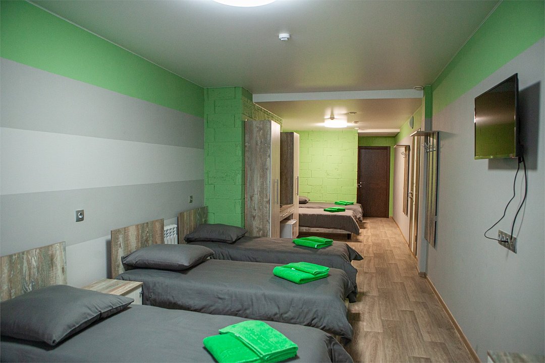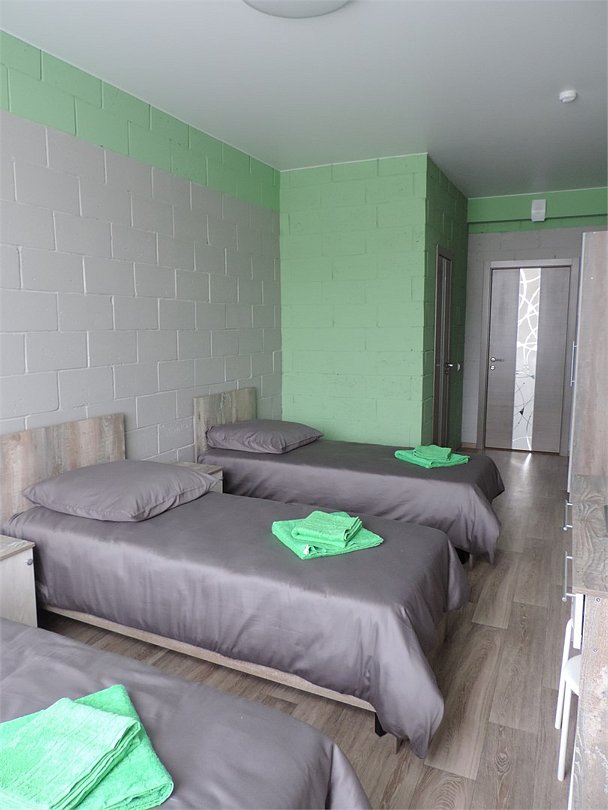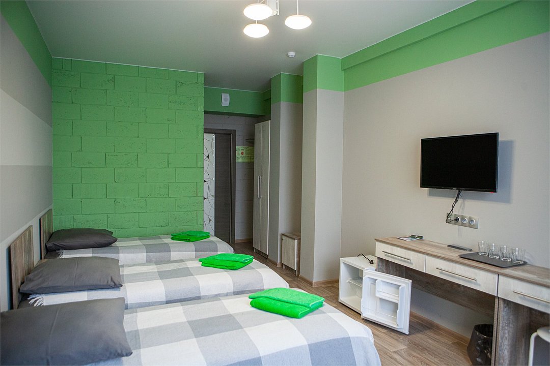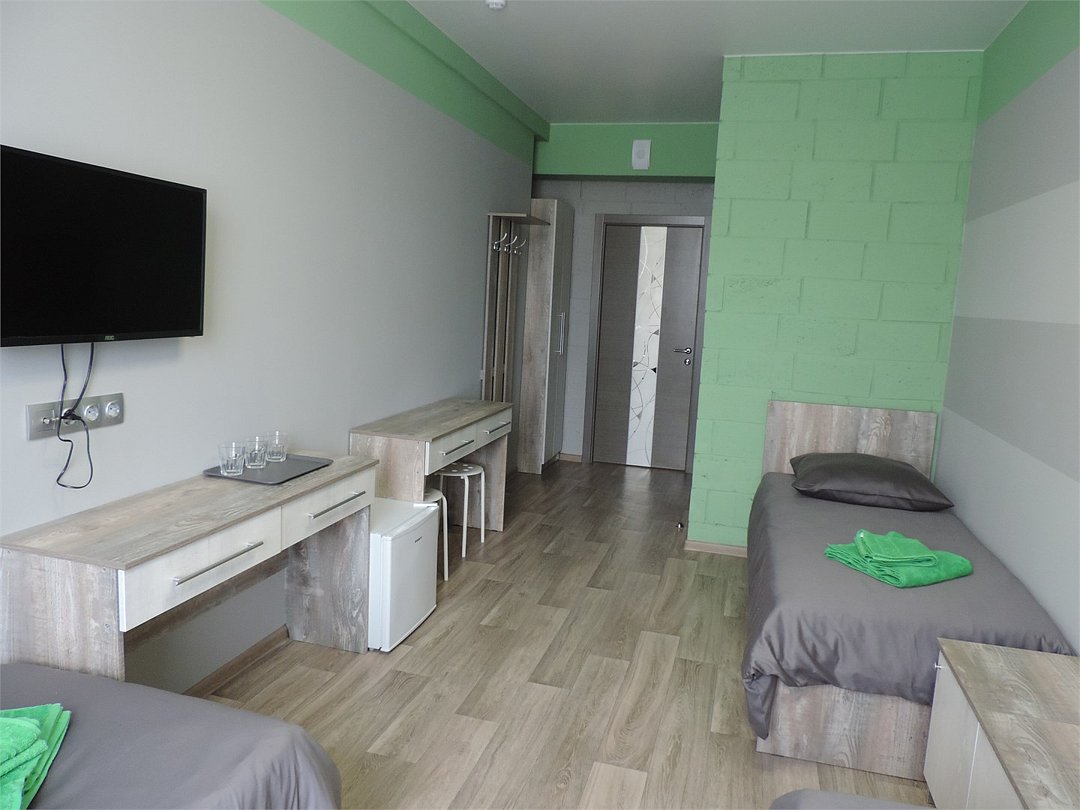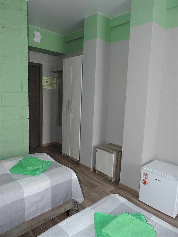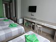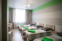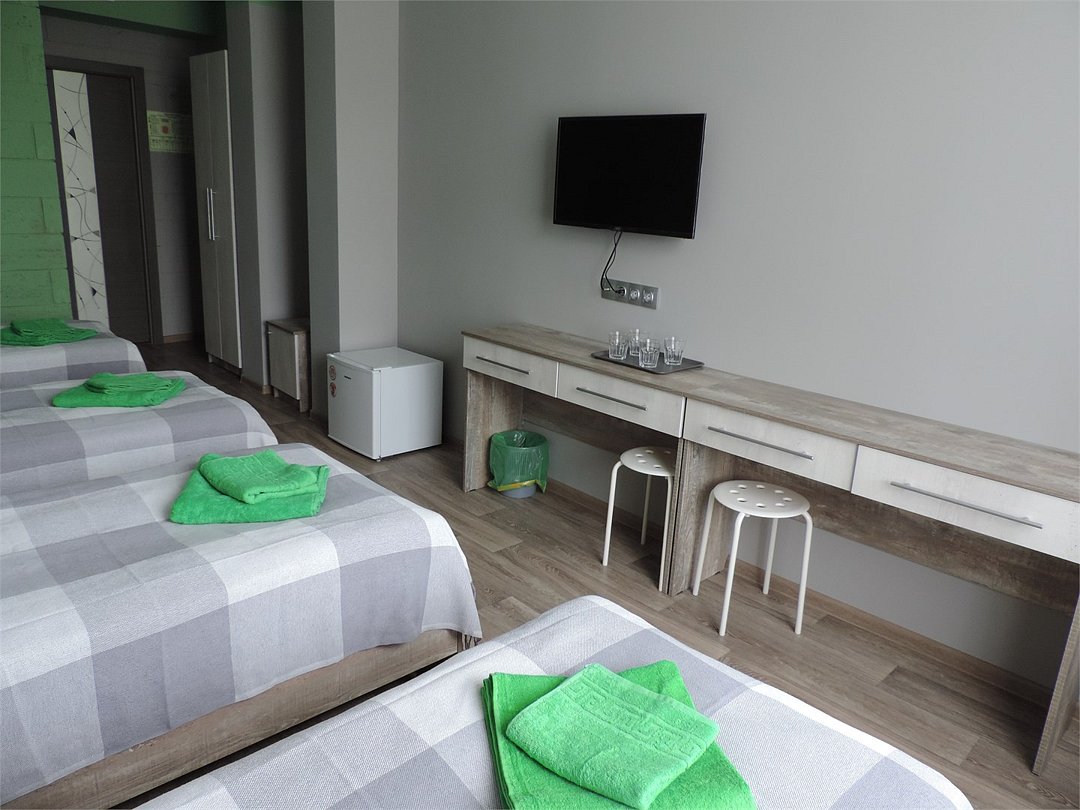 В четырехместном номере все расположено для уютного и удобного проживания. Интерьеры выдержаны в зелено-серых тонах, тонко гармонирующими со всей цветовой гаммой гостиницы. К услугам постояльцев имеется все необходимое: четыре кровати, четыре прикроватные тумбочки, холодильник, кондиционер, телевизор, с расположенный под ним TV столиком. Санузел располагает душем со стеклянными створками, унитазом, раковиной и зеркалом. В небольшой прихожей имеется вешалка и платяной шкаф. Две симпатичные табуретки тоже не будут лишними.Услуги и удобства