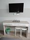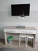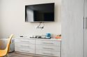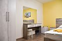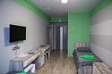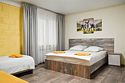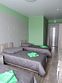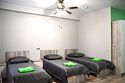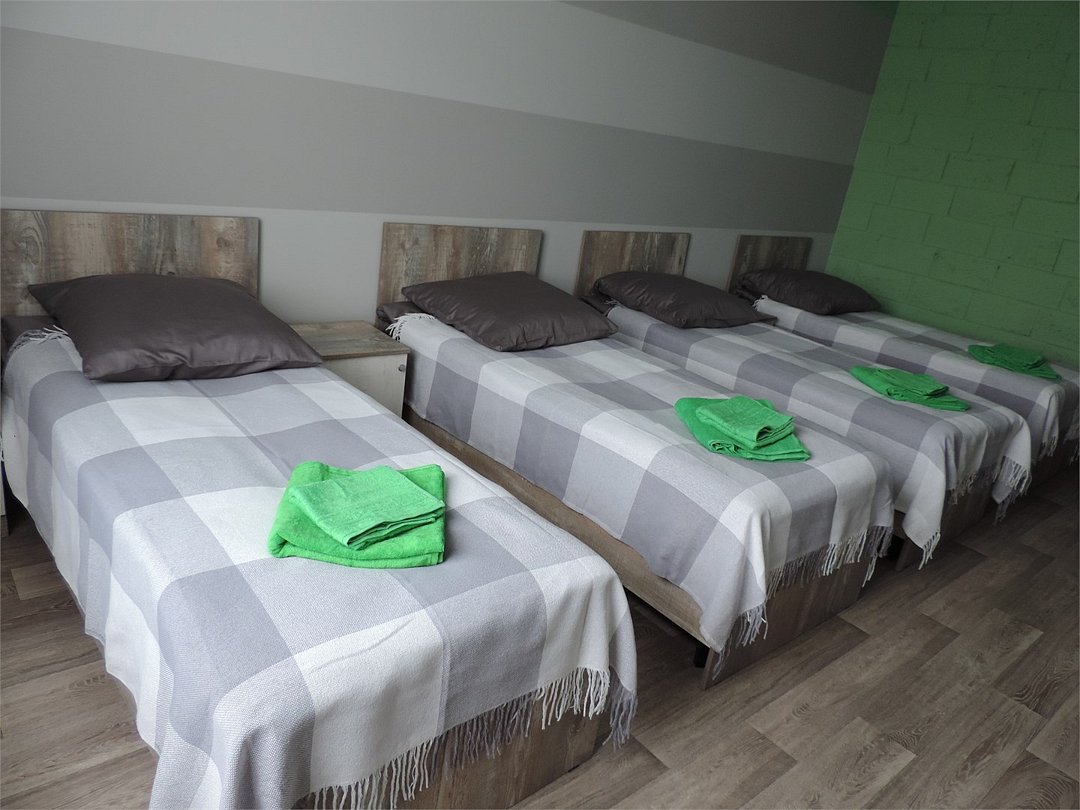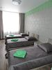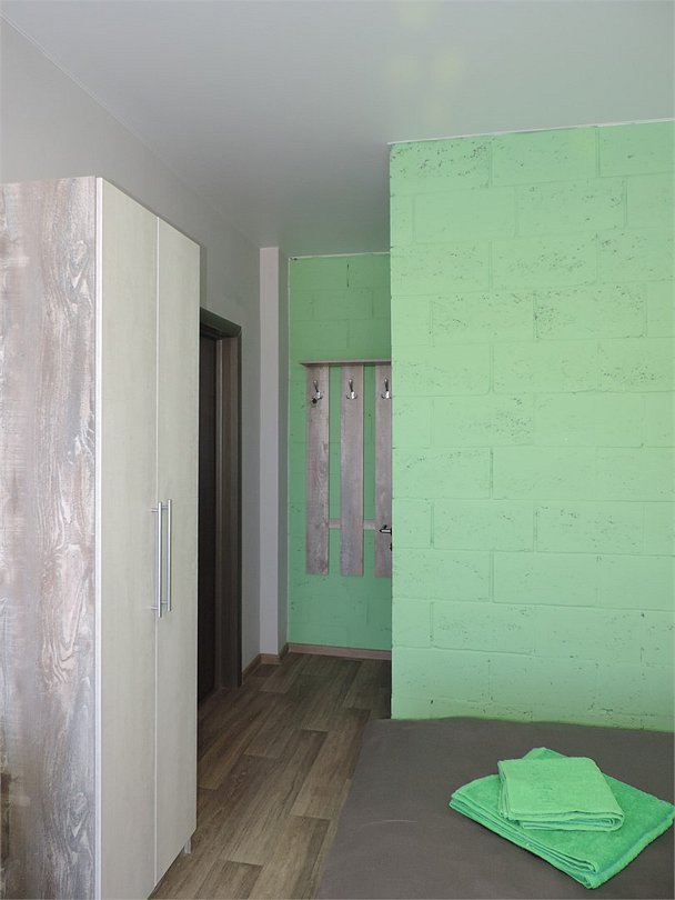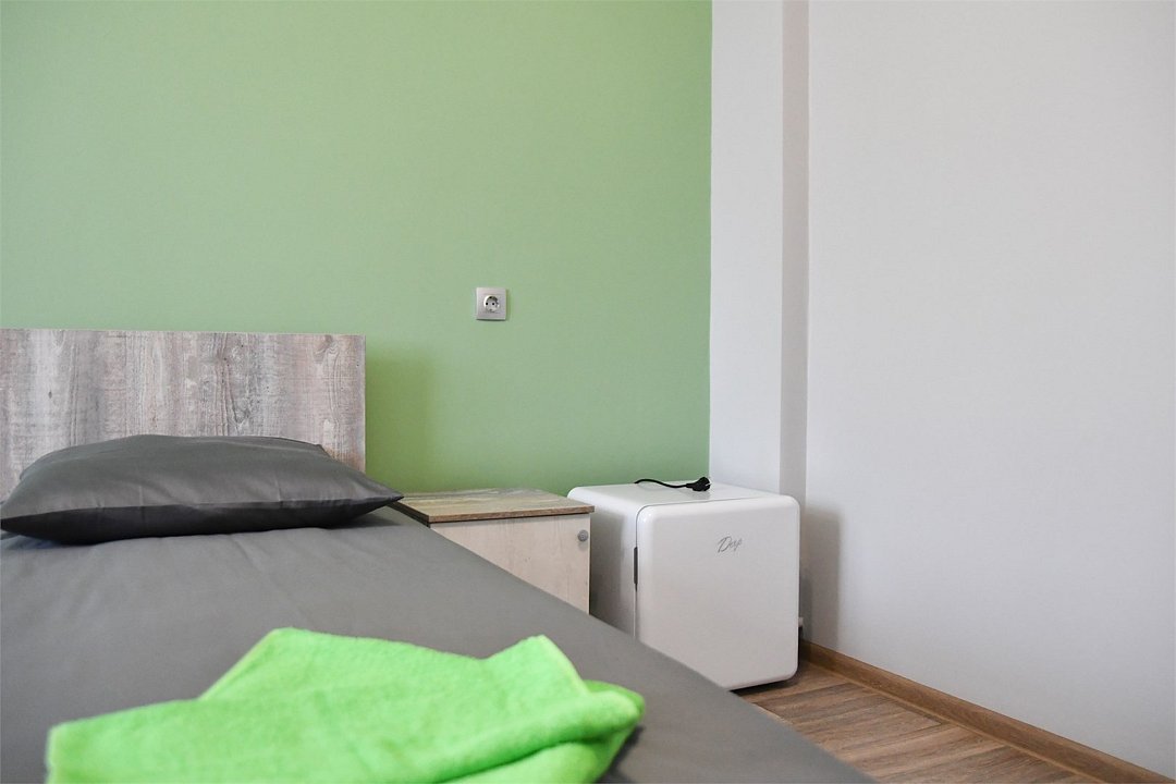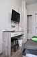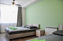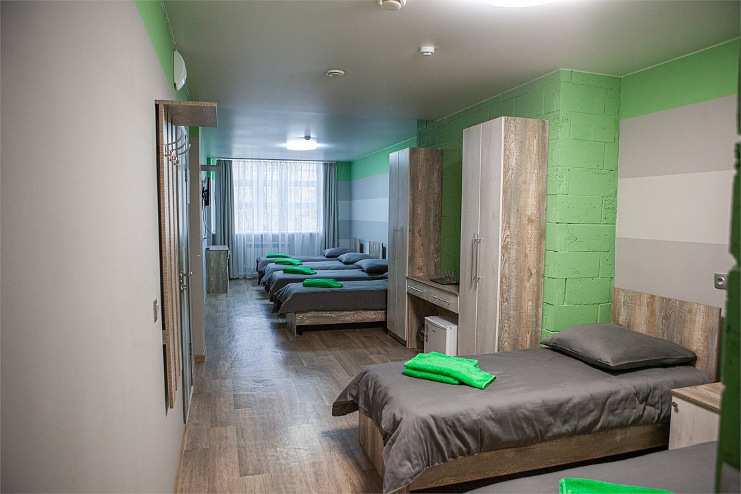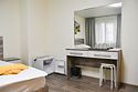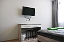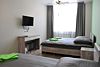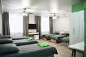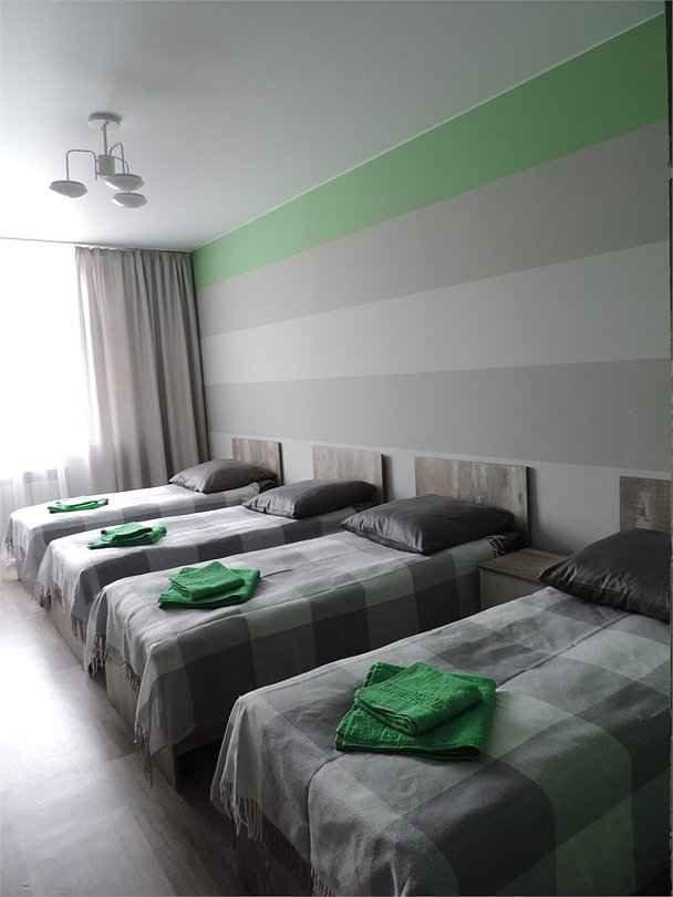 В четырехместном номере все расположено для уютного и удобного проживания. Интерьеры выдержаны в зелено-серых тонах, тонко гармонирующими со всей цветовой гаммой гостиницы. К услугам постояльцев имеется все необходимое: четыре кровати, четыре прикроватные тумбочки, холодильник, кондиционер, телевизор, с расположенный под ним TV столиком. Санузел располагает душем со стеклянными створками, унитазом, раковиной и зеркалом. В небольшой прихожей имеется вешалка и платяной шкаф. Две симпатичные табуретки тоже не будут лишними.Услуги и удобства